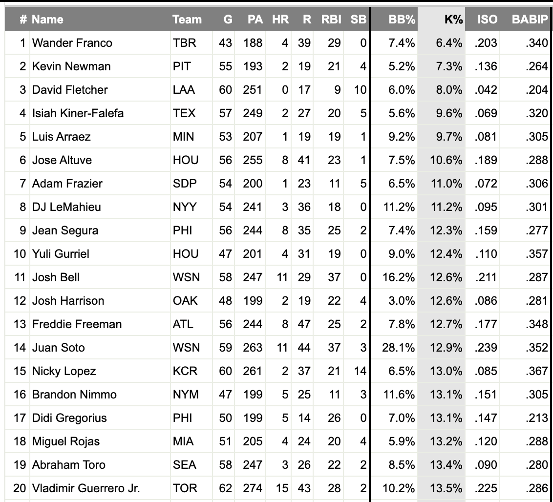 The above image, which is from Fangraphs, shows the K% leaders from July 30th on. Right next to that column is ISO, which is a stat that measures power. Most of the top hitters surrounding Franco on this list hit for measly power. This is because their skills are more contact-oriented. Makes sense right?