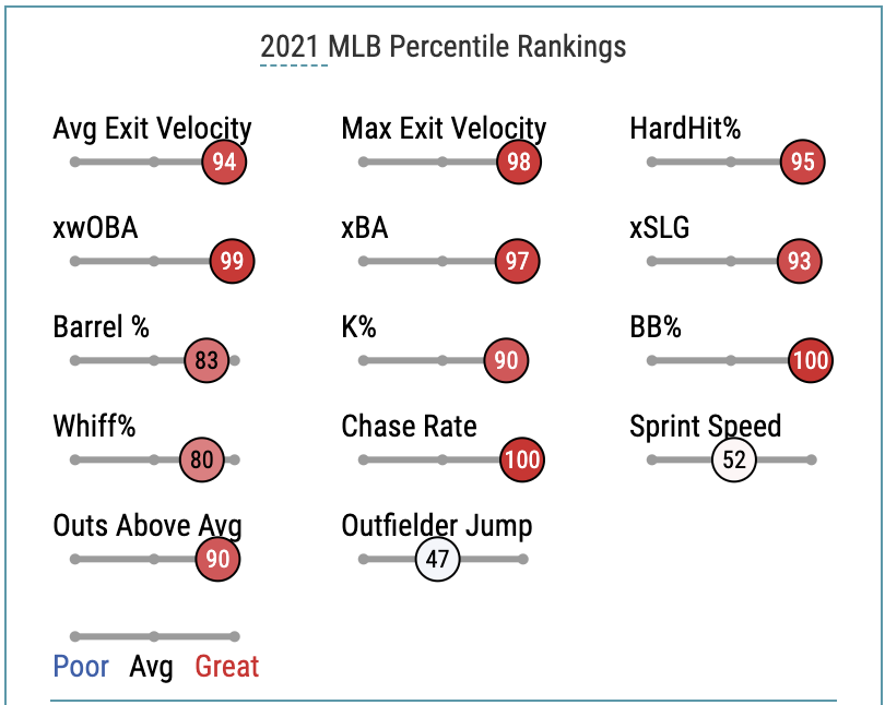 His barrel rate in 2019 and 2020 was 7.7% and 8.7%, respectively. In 2021 it skyrocketed to 15.1%.