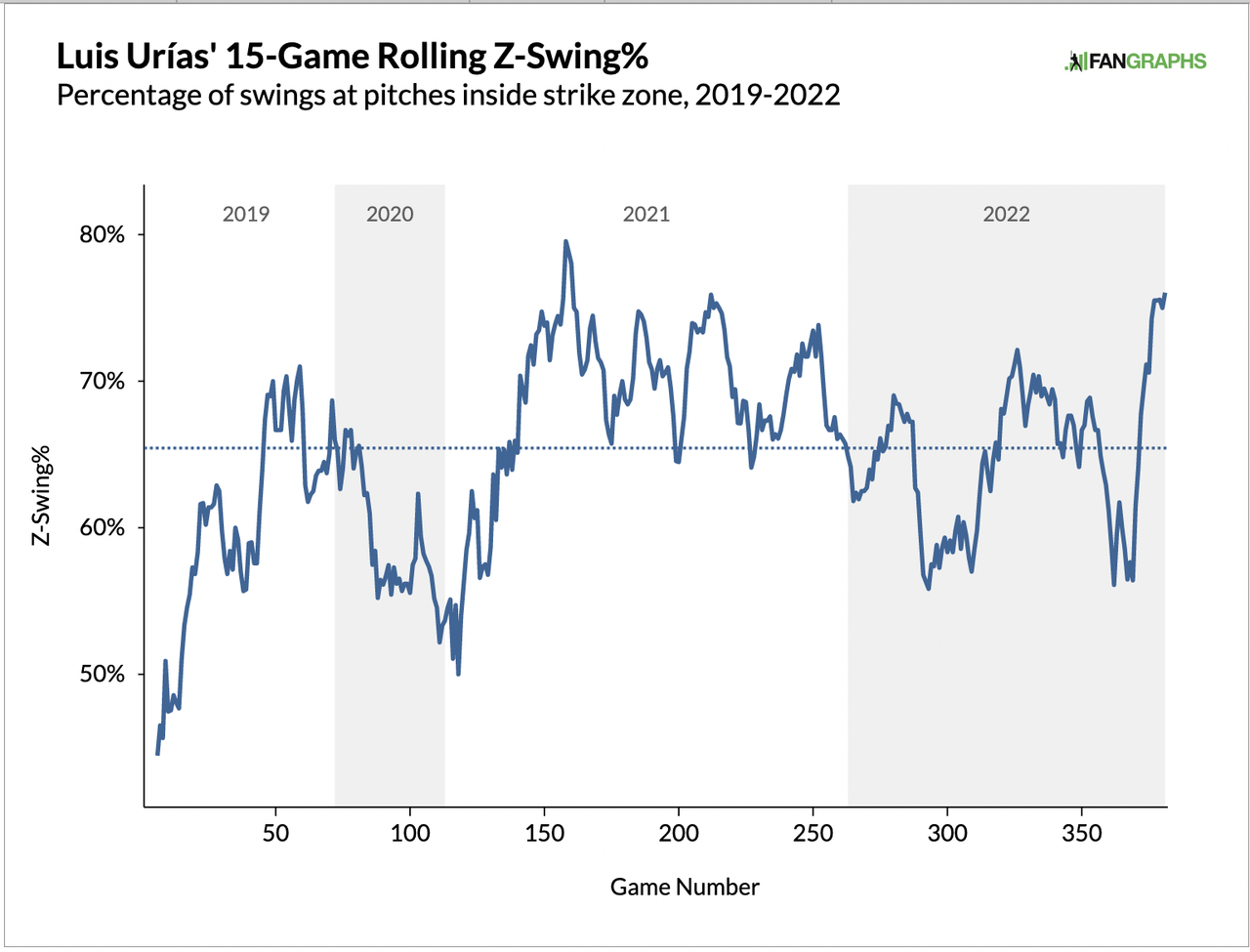 There isn't anything particularly special about Urías other than providing a safety net for IF-needy drafters. The 25-year-old "broke out" in 2021 by being more aggressive on pitches in the strike zone (see graph below). The deadened ball from 2022 seemed to affect his power numbers, but he's overall been 11% better than league average since the start of '21.