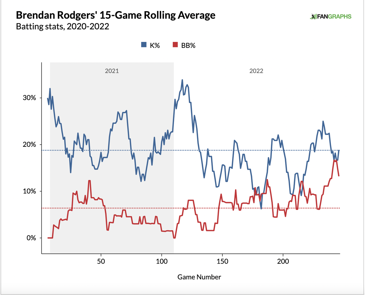 Rodgers still hits too many grounders (career 52%), but as shown below his plate discipline continues to improve during his time in the majors. Add in the fact you're getting cheap exposure to Coors (and the potential for spike weeks, something I'll write about soon), and there's an upside case for weekly Best Ball scoring that isn't reliant on Rodgers actually taking a step forward as a hitter.