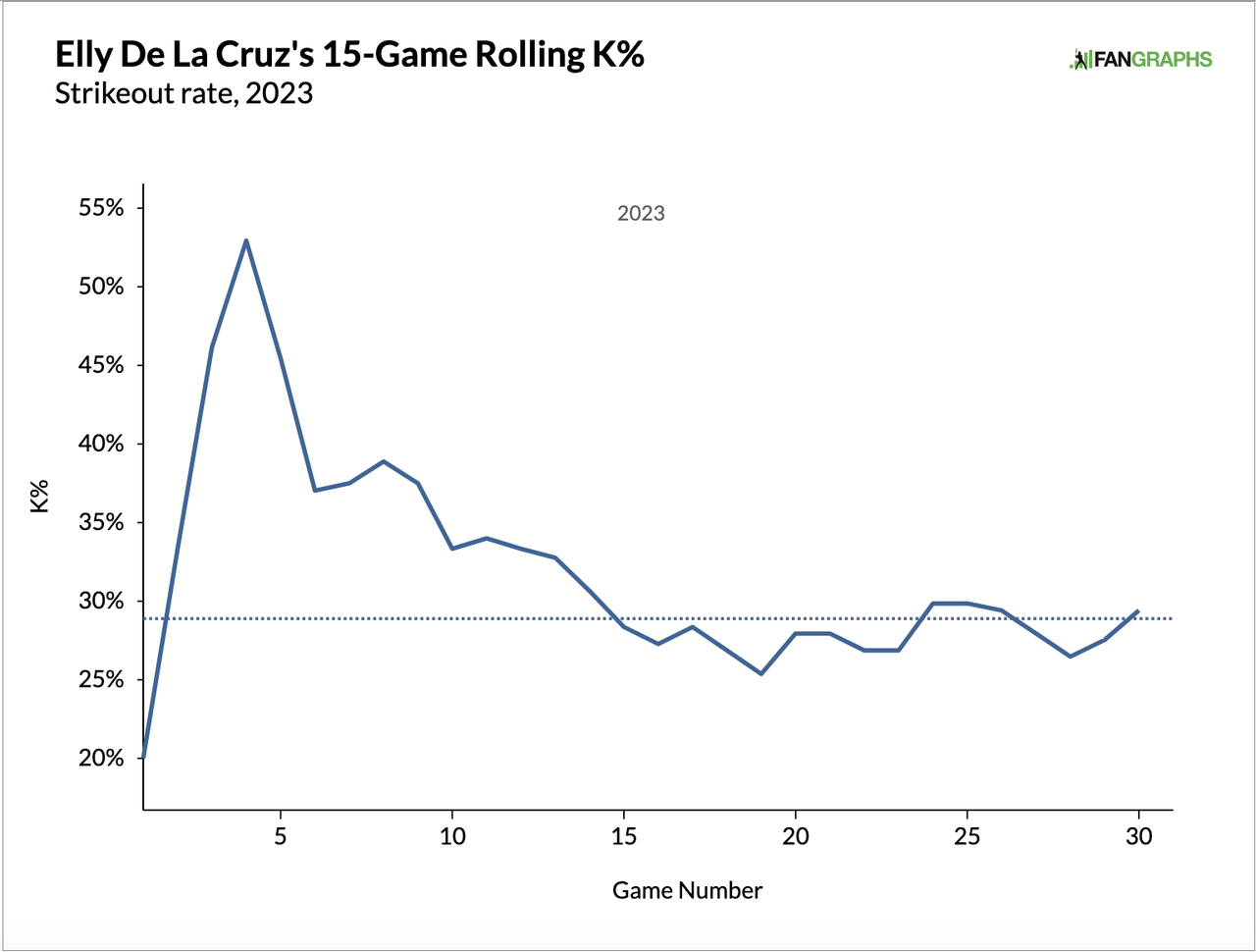 But the basic idea is that while Elly is undeniably incredible, you're paying for his absolute ceiling outcome at this price. His BABIP sits at .440 right now, and yes his elite speed means he'll run high BABIPs in his career, but that's just too high to be sustainable. Every projection system gives him between a .334 and .359 BABIP rest-of-season. That's the sort of "high BABIP" I'm willing to peg him for based on his tools.