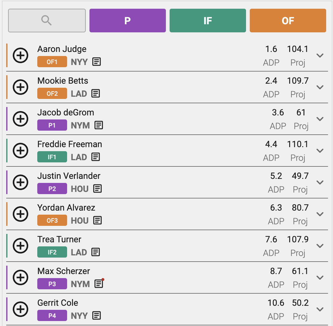 So yeah, it should be obvious that Aaron Judge, Mookie Betts, and Jacob deGrom are going to be desirable in a draft setting like this. This isn't to tell you to not target them, though. I mention this because it's going to be difficult (impossible?) to fill a team with all the best players from the Dodgers, Astros, Yankees, or Mets. Additionally, let's say you reach Round 3 with 2 of those stacks, just understand that other managers will have good/great players from those squads.