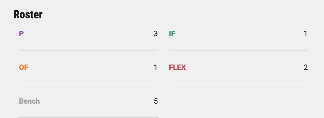 Just 7 of the 12 players taken can score for you in each round. This includes 3 pitchers, 1 infielder, 1 outfielder, and 2 "FLEX" players (that must be hitters).