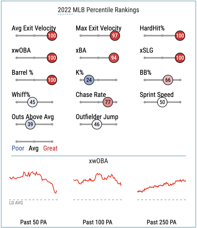 The reigning NL MVP is sporting just a 6.8 BB%, which is wayyy down from his previous career-low of 13.8%. For comparison, his 2022 BB% is in the 36th percentile of qualified hitters; he was in the 99th-100th percentile in 2021 and 2020.