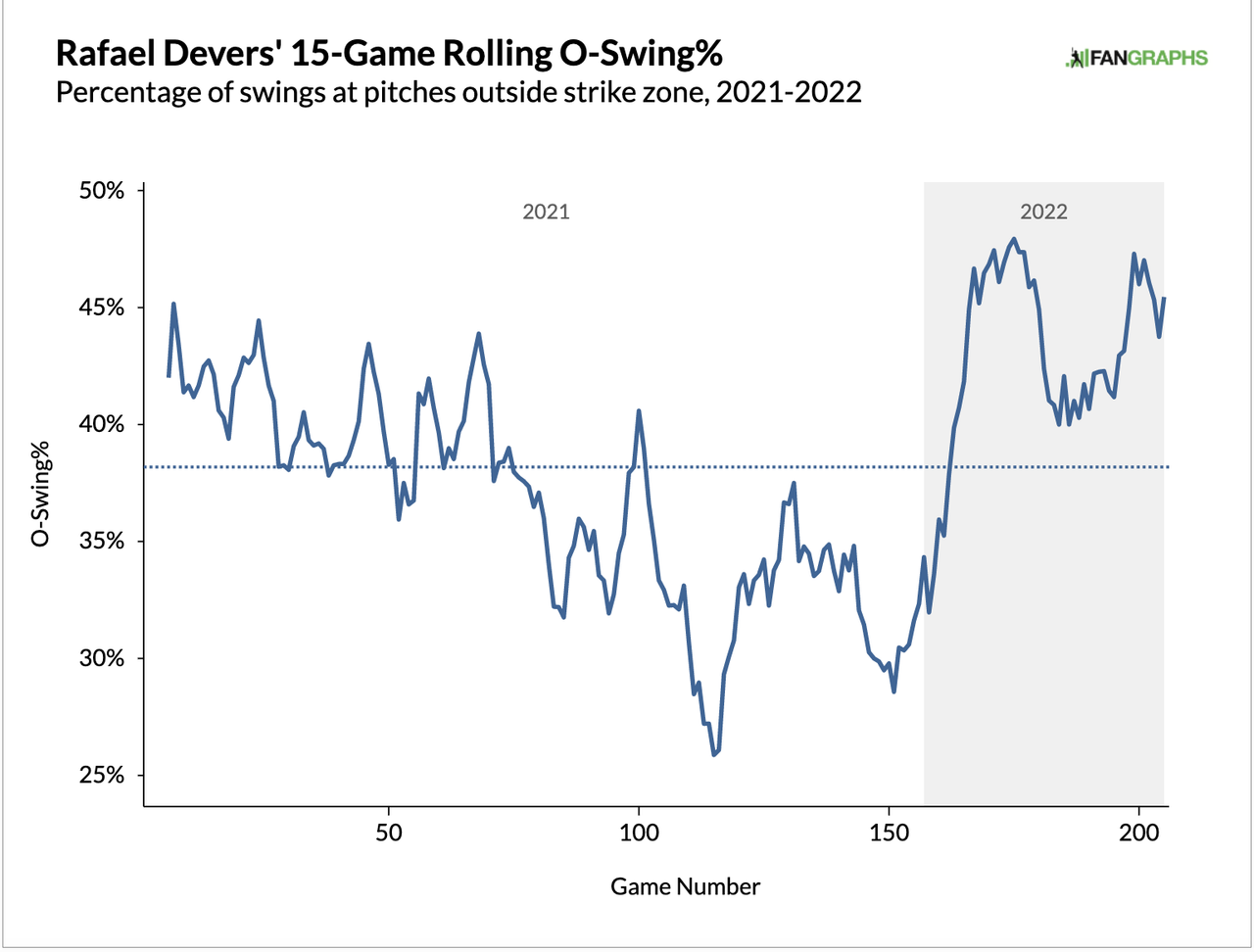 What's interesting is that he's leaning even more heavily into his swing-happy ways. Devers got his chase rate (O-swing%) in check throughout the 2nd half of 2021, which I thought led to his breakout. However, he's chasing again to begin 2022. He's walking less than ever before and swinging more than ever before.
