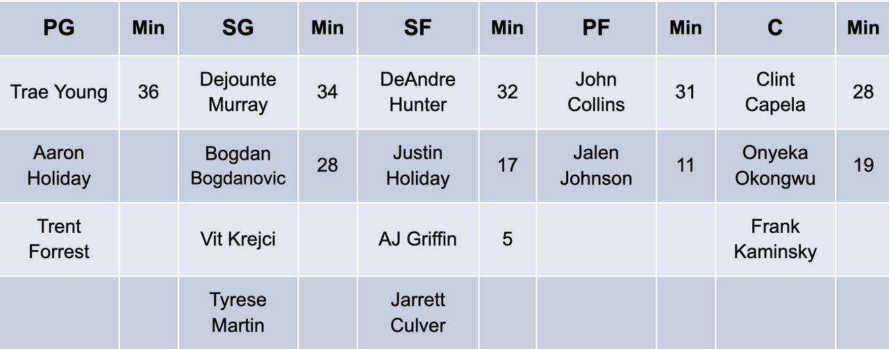 Lost: Kevin Huerter, Danilo Gallinari, Delon Wright, Gorgui Dieng, Kevin Knox, Lou Williams, Skylar Mays, Timothe Luwawu-Cabarrot, Sharife Cooper, Chaundee Brown