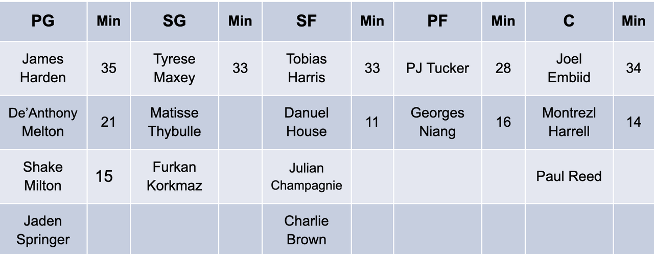 The biggest statistical loser of the Harden trade was undoubtedly Harris. He averaged 18.3-7.3-3.7 before Harden’s arrival, even as his heavy-usage second-unit minutes from the prior season were eliminated. Once Harden arrived, Harris averaged 14.6-5.5-2.1 in 21 games with the former MVP. Those stats are a bit misleading because Harris did so while shooting well from the floor—nearly 50% overall, and north of 40% from three. His usage fell sharply from 23.3% without Harden to 17.9% with him. His reduced role can best be summarized this way: when starting with Harden, Harris’ usage was lesser or equal to that of Precious Achiuwa, Raul Neto, and Doug McDermott.