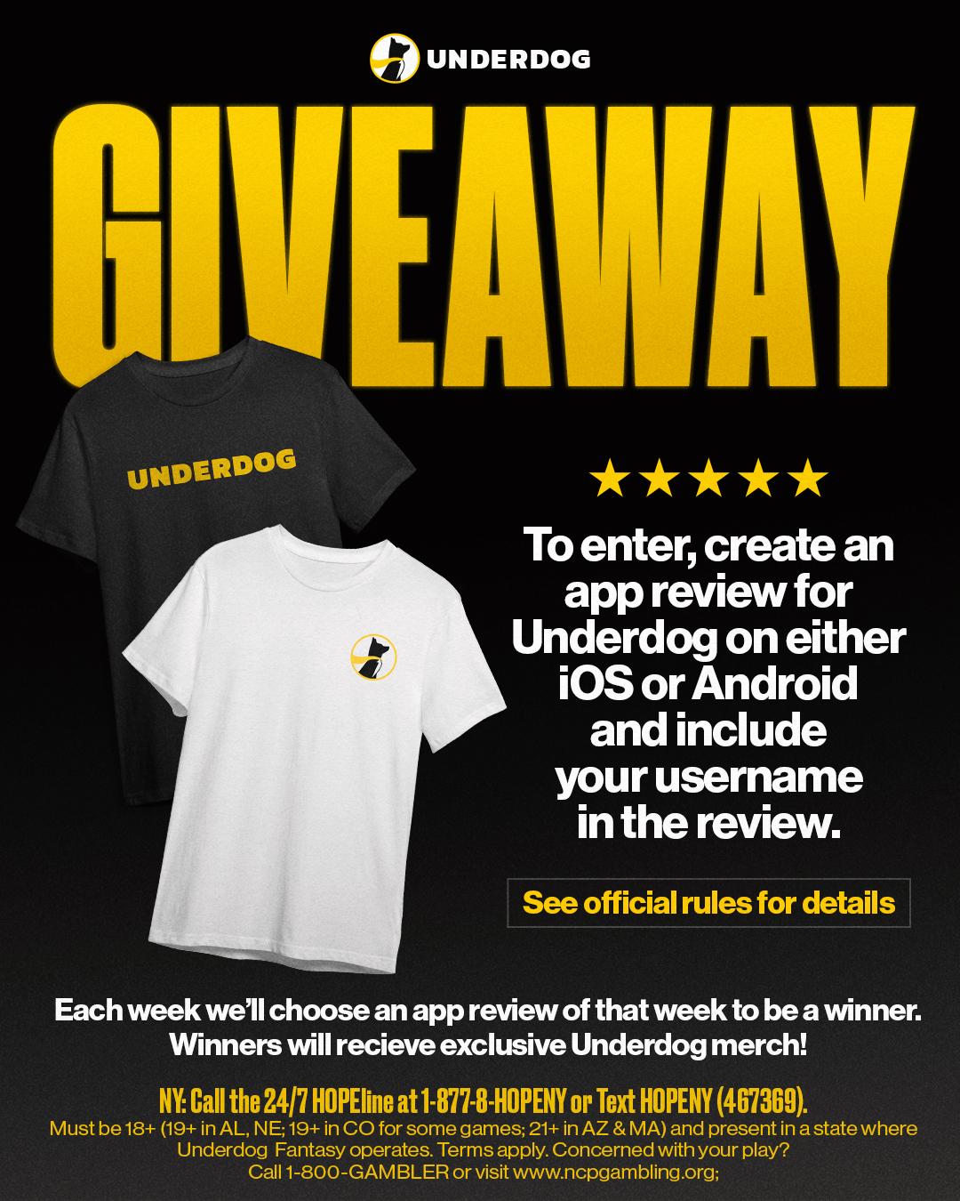 Sponsor reserves the right to discontinue the giveaway at any time. To enter the Giveaway, follow these 3 steps during the Promotion Period for your chance to win: (1) create an Underdog account; (2) complete an app review for Underdog Fantasy on either IOS or Android; and (3) Include your username in the app review.