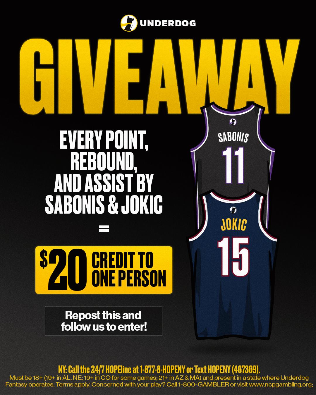 The amount of winners and Underdog bonus credit given away will be determined by the number of Points, Rebounds, and Assists (“PRA”) totaled by Domantas Sabonis and Nikola Jokic in the game between the Denver Nuggets and Los Angeles Lakers, and the game between the Sacramento Kings and Phoenix Suns on Friday, March 14, 2025. Underdog will award one $20 bonus credit to customers according to the total PRA for each player, up to a maximum of 150 winners. For example, if Luka Doncic finishes the game with 50 PRA, and Nikola Jokic finishes the game with 40 PRA, Underdog will award 90 winners $20.00 in bonus credits. Winners will be selected at random and will receive $20.00 in Underdog Fantasy bonus credit deposited to their Underdog account.