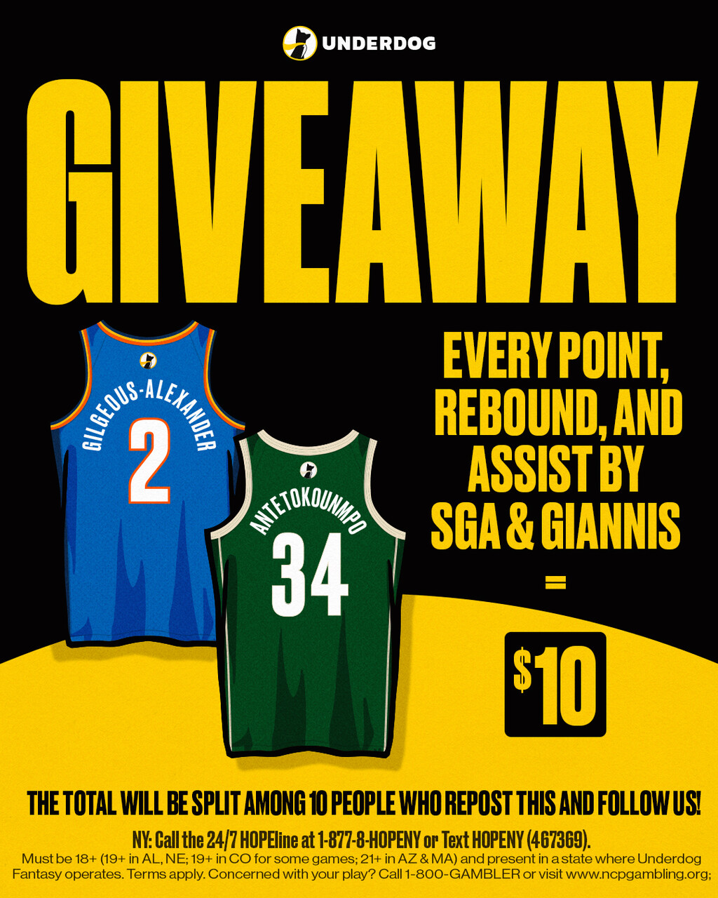 On Tuesday, December 17, 2024 from 11:00 AM EST to 8:30 PM EST (the “Promotion Period”), Underdog Sports, LLC (“Sponsor”) will host a giveaway. Follow these 3 steps: (1) follow Underdog Fantasy at @UnderdogFantasy on Twitter; (2) comment your Underdog username as a reply to the original Twitter post; and (3) repost the post. The total promotional credit awarded will be determined by the number of “PRA” (points + rebounds + assists) totaled by Shai Gilgeous-Alexander and Giannis Antetokounmpo – up to a maximum of two hundred (200) PRA – in the game between the Oklahoma City Thunder and Milwaukee Bucks on Tuesday, December 17, 2024. $10.00 will be awarded per PRA. Ten (“10”) winners will be selected at random and will receive an equal split of Underdog Fantasy promotional credit deposited to their Underdog account.