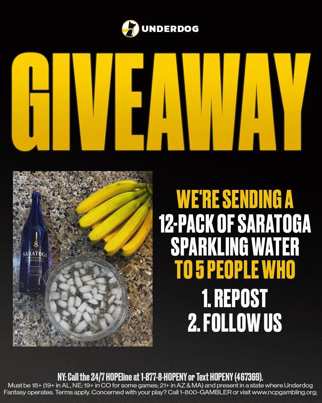 On Monday, March 24, 2025 beginning at 3:00:00 PM ET and ending Monday, March 24 at 11:59:00 PM ET (the “Promotion Period”), Underdog Sports, LLC (“Sponsor”) will host a giveaway. Follow these 2 steps during the Promotion Period for your chance to win: (1) follow Underdog at @Underdog on Twitter/X; and (2) repost the Tweet. Five (“5”) winners will be selected at random and will receive a 12-Pack of Carbonated Saratoga Sparkling Water, to be shipped to the winner’s specified residential address.