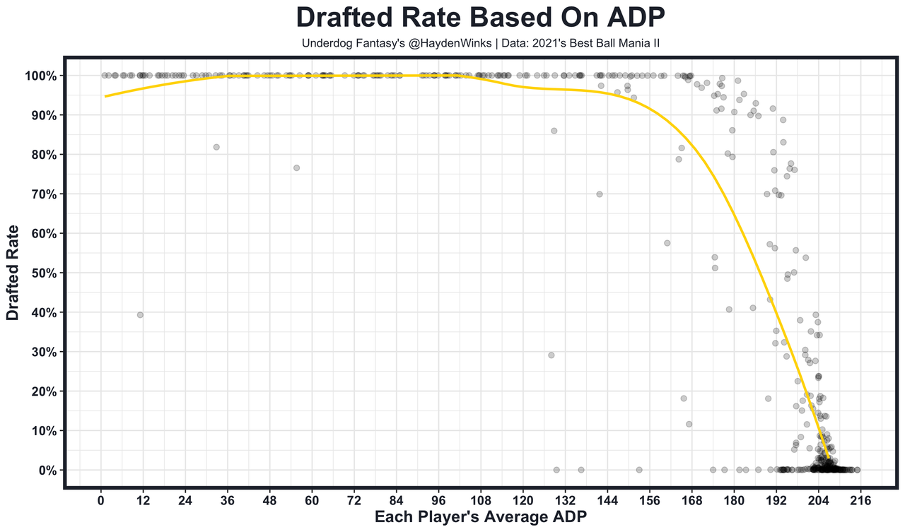 Last year, players with an average draft position of 170th overall or so were drafted just about every single time. There were a few exceptions based on injuries or late-camp news, but as a general rule of thumb the players inside the top-14 rounds are getting drafted every time. Players with an ADP in the 170-190 range get drafted about 85% of the time, and then players in the 190-210 range are just about 50% or lower to get drafted.