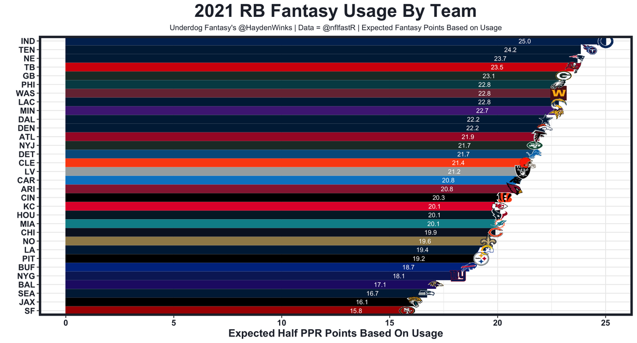 It’s a misconception that the Ravens use their running backs a lot. They’ve been bottom-five in expected half PPR points in each of the last three seasons, and to make matters worse, this coaching staff has used a committee approach in each of them. Dobbins has plenty of burst to make the most of his situation, but his injury and the overall set up of the offense work against him. Gus Edwards is under contract still. Underdog Fantasy ADP: RB17.