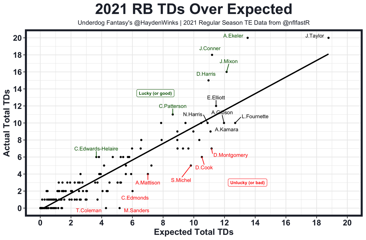 Touchdowns are even more valuable in half PPR best ball because this is a spiked week game, so making sure we have accurate touchdown projections is an edge. The starting point for projecting touchdowns is by comparing last year's touchdowns to their "expected touchdowns", a metric I created using NFLfastR data. My expected touchdowns separates RBs from WRs and TEs, and it uses yards to the end zone, air yards, and distance to the sideline for its projection. Yards to the end zone is the most impactful, of course.