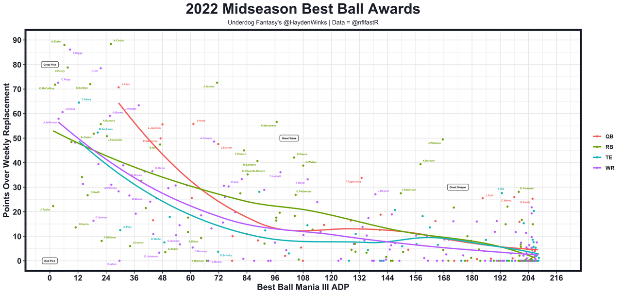 Elite QB ... There was a consensus top-6 "Elite QBs" and most of them are smashing; Josh Allen (10th in Better In Best Ball Points vs. 29th in ADP), Jalen Hurts (17th vs. 61st), Lamar Jackson (19th vs. 48th), and Patrick Mahomes (23rd vs. 47th). In fact, there is only one player (Jaylen Waddle) to have more Better In Best Ball Points than any of these 4 QBs who was drafted between Josh Allen and Jalen Hurts. More importantly, there has only been one competitor to the Elite QBs -- Tua Tagovailoa.
