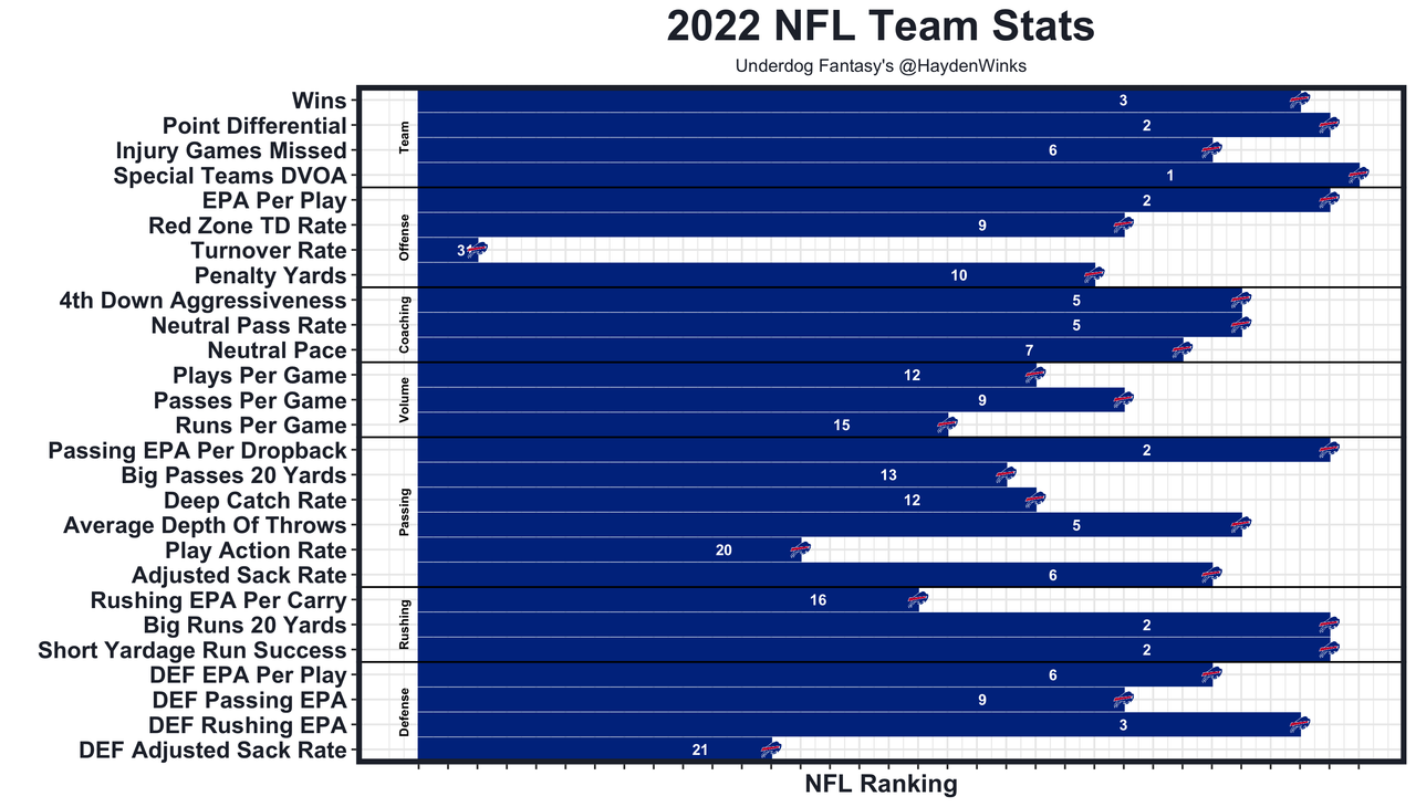 This is as good as it gets in terms of team balance. Only their 31st-ranked turnover rate on offense sticks out as an obvious place to improve. Expect that to naturally regress positively with Josh Allen likely healthier and with 4-of-5 OL starters returning.