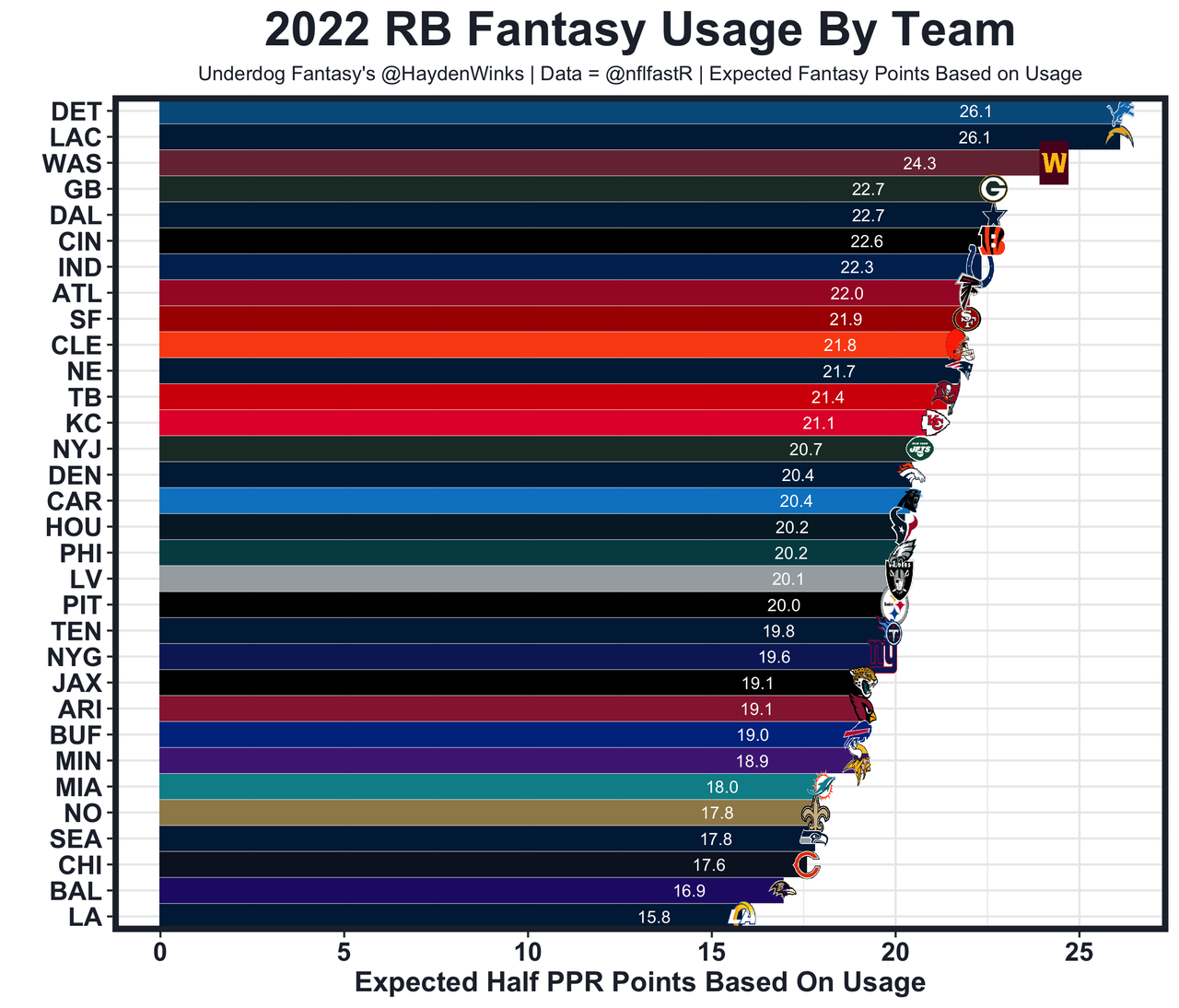 Of all teams, I think the Bills could have the silliest rotation of RBs. James Cook (5'11/190) has the clearest role as a 2nd-year pass catching back. His problem is Buffalo has finished 20th and 28th in RB receptions because Allen can run it himself. Cook also doesn't have early-down size, leading to just one (1) game with 50% snaps as a rookie. He finished as the RB62 in fantasy points over replacement. I don't draft him in half PPR best ball often... Damien Harris ($1.8M with $500k guaranteed) is the presumed rusher in the Devin Singeltary role from last year when he was the RB40 and 91st overall player, but 33-year-old Latavius Murray did sign for more guaranteed money ($700k) this offseason. Both offer the size needed to split goal line work with Allen. Throw in Nyheim Hines' small role, and I think we're in trouble all around. Buffalo RBs *combined* for just 19.0 expected half PPR points last year (25th).