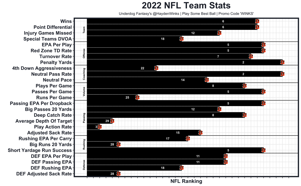 The Cincinnati Bengals core is squarely in their NFL primes, and we can draft them all on Underdog Fantasy with promo code 'UNDERBLOG' to match your first deposit up to $100. We have the biggest fantasy football tournament of all time ($15M) right now.