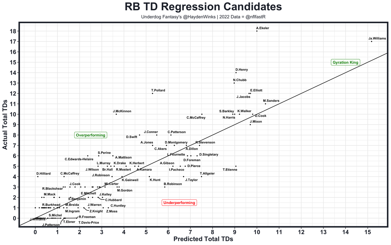 Tony Pollard ran absolutely pure last year (again), scoring +4.7 TDs above expected. That rate likely dips next year, especially if his broken leg has any lingering effects, but Ezekiel Elliott had a whopping 10.2 expected TDs compared to Pollard's 7.3. Combining them would would make Pollard a potential RB1 overall candidate if he can handle a bigger-than-usual workload. He was the RB8 while running hot as a change-of-pace. The Cowboys likely look at some bigger backs before the season starts, with Malik Davis (5'10/207), Deuce Vaughn (4'5/128), and Ronald Jones (5'11/208) combining for one of the smallest rooms in the NFL. Davis has some burst but got tangled at the LOS and didn't force missed tackles in a small sample.