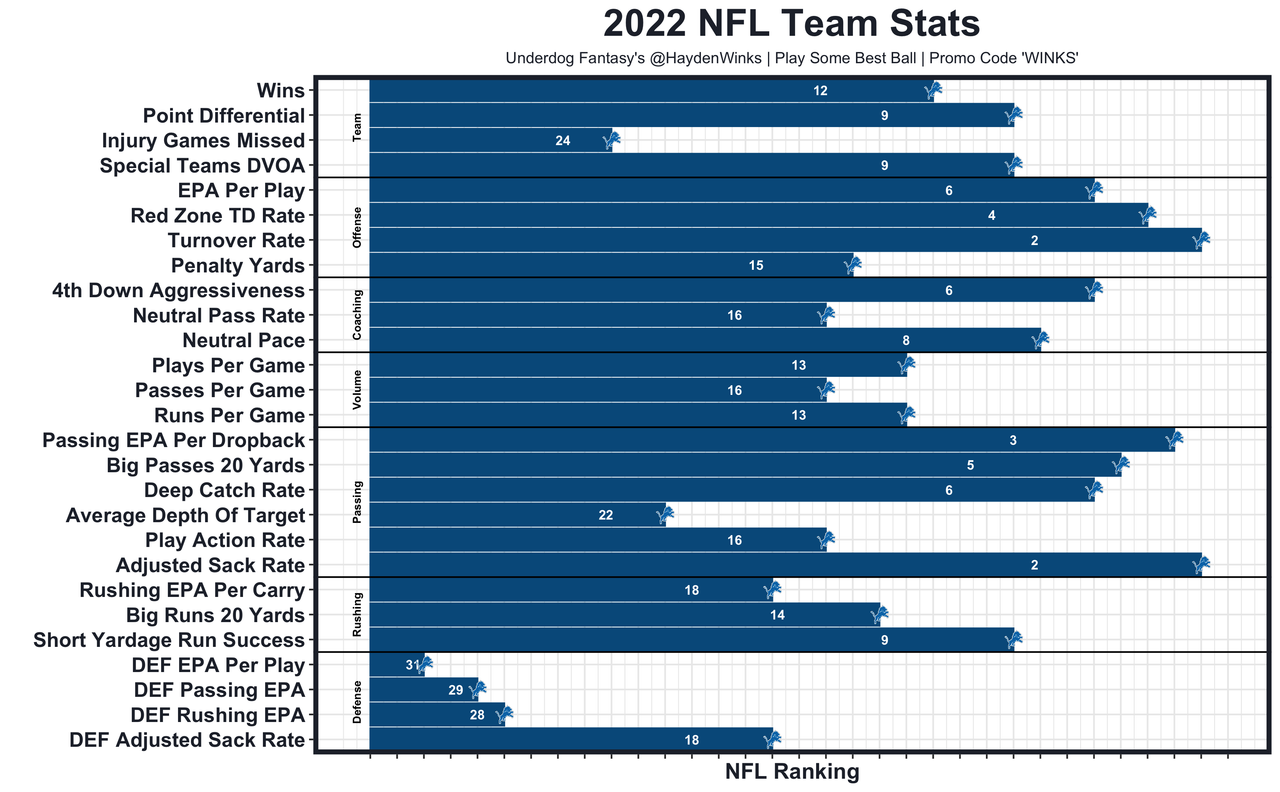 It was a smooth offensive operation last year, and a lot of the core pieces are back. The Lions will have to overcome some natural regression, however. They were top-6 in turnover rate (2nd), red zone TD rate (4th), and deep ball catch rate (6th), which are all valuable yet volatile year-to-year. Detroit's biggest and most predictable room for growth is on defense, where they were 31st in EPA per play allowed. They added starters CB Cameron Sutton, S Chauncey Gardner-Johnson, LB Jack Campbell, and NCB Brian Branch.