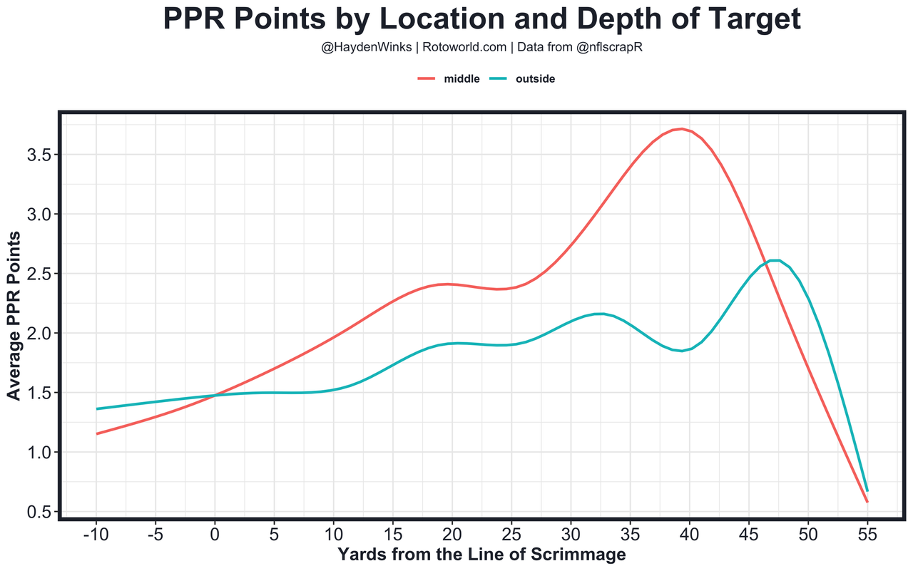 In fantasy football, this is key because while deep targets are extremely volatile (see below), they're still extremely valuable targets (see even more below).