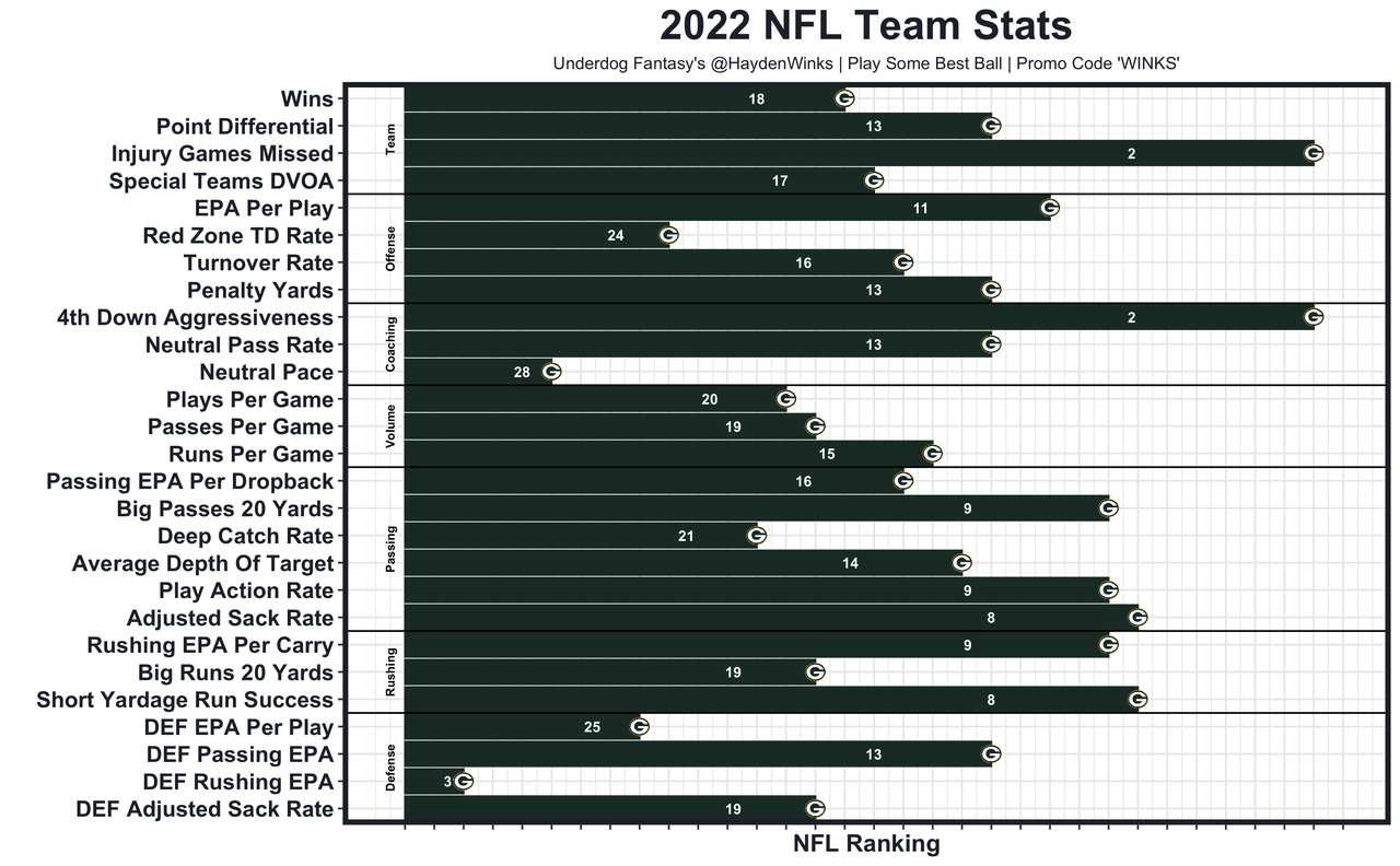 A lot of last year's data can be tossed to the side because of the QB change, but I do like coach Matt LaFleur ranking 2nd in 4th-down aggressiveness and the offense ranking top-10 in short-yardage run success rate (good OL). The defense once again was killed on the ground, allowing the 2nd-most EPA per carry despite plenty of good starters. Until that gets fixed, this Packers' defense will be worse than the sum of their parts.