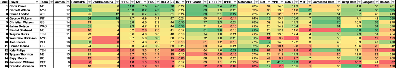 Christian Watson had +2.6 TDs above expectation as a receiver, then ripped off 46- and 15-yard rushing TDs. He also caught an unsustainable 75% of his contested catches. Natural regression is coming for him, even if he's going to be an explosive player long term (that's a fact). The Rodgers to Love drop equates to about 5% completions over expected and 7% in success rate, notable differences. It's possible Watson's game is particularly hurt given his deep 14.3 average depth of target. If you really believe in his talent, then there's upside. If you think he's a natural No. 2 receiver, then we should expect lots of inconsistencies. Watson had just one (1) game with 6+ receptions, yet was the WR21 in fantasy points over replacement per game thanks to his long scores...