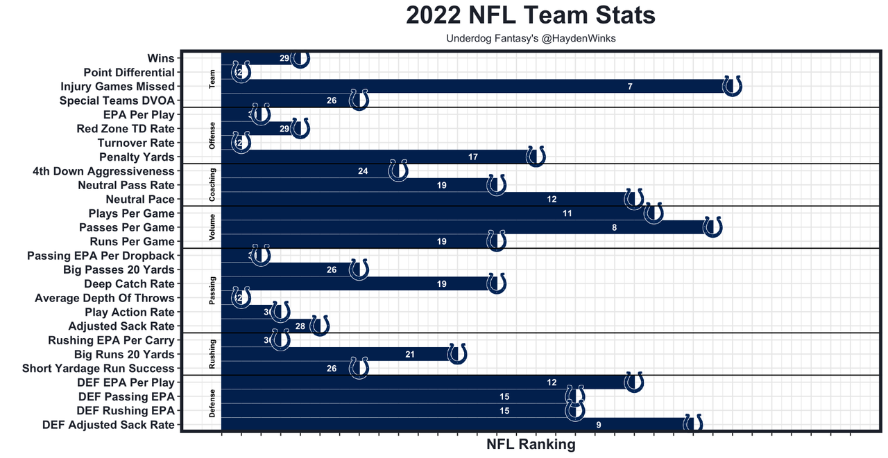The Colts are starting from scratch, but I at least see the vision with the coaching staff and a dual-threat young QB. That said, this team is definitely starting from scratch. The OL is average with question marks at LT and RG, and the defense traded away stud CB Stephon Gilmore. At least, the Colts will be watchable with Anthony Richardson's rushing ability and his downfield aggressiveness. This unit was last in deep ball rate, 30th in play action rate, and 29th in red zone TD rate.