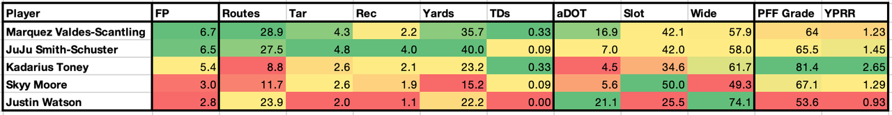 These are per-game stats from Week 10 through the Super Bowl, when Mecole Hardman left the offense with an injury. JuJu Smith-Schuster leaves behind a near full-time role, one that requires running real routes on the perimeter and led to a WR38 finish in fantasy points over expected per game. ... The other one of those real WR spots belonged to Marquez Valdes-Scantling, who was the primary deep threat (15.2 aDOT) and a 2-WR set starter. MVS has a $11M cap hit this year with another $2M guaranteed next year (that's quite a lot) and offers a size/speed skillset that the rest of this WR group lacks. Last year was unlucky in the TD department (2 TDs on 3.7 expected scores), leading to a forgettable WR77 finish in fantasy points over expected per game. He's not a redraft target, but there's a chance the "better in best ball" truthers run hot with TD and deep threat variance this year. ... Justin Watson was 3rd in line with routes during this stretch, but he was out there to block in certain looks and run clear out routes way downfield. Hopefully his snaps go elsewhere because his career 1.0 YPRR is boring. His special teams experience and contract ($1.8M guaranteed) make him a near lock for an active roster spot, however. ... A candidate for Watson's 24 routes per game is 2nd-round rookie Rashee Rice, who has some JuJu qualities (6'0/204 with a 4.5 forty). He moved from the slot to the outside, maxing out at 3.0 YPRR as a senior at Houston. In camp, Mahomes has complimented his feel for zone. There's nothing high-ceiling about his profile, but the Chiefs can use a boring yet reliable option right now.