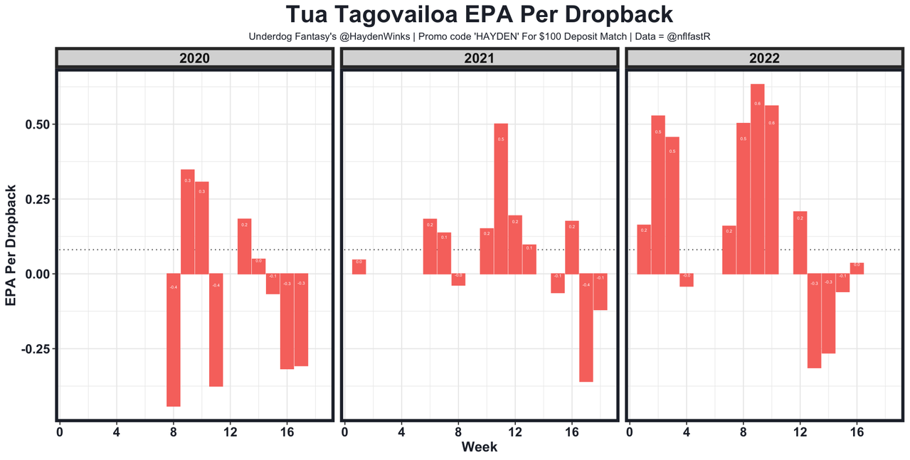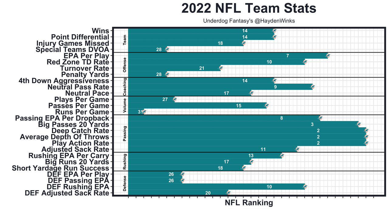 It was a tale of two seasons for the 2022 Dolphins. Through Week 12, Tua was 1st in EPA per play (+0.40) by a country mile. Then he missed some snaps with perceived concussions, while defenses made some key adjustments (mainly playing more press man and playing inside leverage to take away efficient middle-field throws). In four games after Week 12, Tua was 31st in both EPA per play (-0.14) and completion percentage over expected (-9%). Small sample, sure. But somewhat concerning aside from the obvious injury concern. With that said, I do trust coach Mike McDaniel to have a counter. Perhaps it's a more balanced gameplan after ranking 31st in runs per game. Perhaps it's just not ranking 28th in special teams DVOA and 28th in penalty yards. Either way, this is a very fun but volatile team. It's one of my favorite offenses to watch.