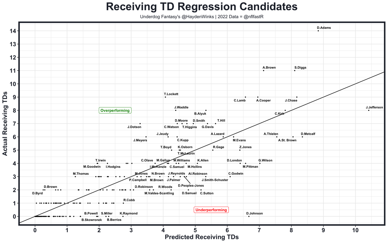 Tyreek Hill ate without Patrick Mahomes, ranking as the WR4 and 8th overall player in fantasy points over expected per game. The 29-year-old was PFF's top-graded receiver, on an absurd 3.0 yards per route run. The only on-field issues with his Round 1 status is the fragility of Tua's health and the potential of losing valuable RPO targets (+10.1 yards per target) after defenses started taking them away late last year. Tyreek's off-field issue was another run in with the police. There's enough risk for me to take Cooper Kupp ahead of him every single time. ... Even certified ballers are bound to regress. That's Jaylen Waddle, after going from 7.3 to 11.3 yards per target last year. The Dolphins will likely not hit on the cylinders they were hitting on in 2022, which easily could slide Waddle's TDs closer to his 4.4 expected scores. His +3.6 TDs over expectation were the 5th-highest at the position. He was the WR11 per game on WR27 in expected fantasy points. ... It's dry behind them. Cedrick Wilson ($8M cap hit) is making more than slot-only Braxton Berrios ($3.5M) and 30-year-old Chosen Anderson ($1M). This is a two-receiver show.