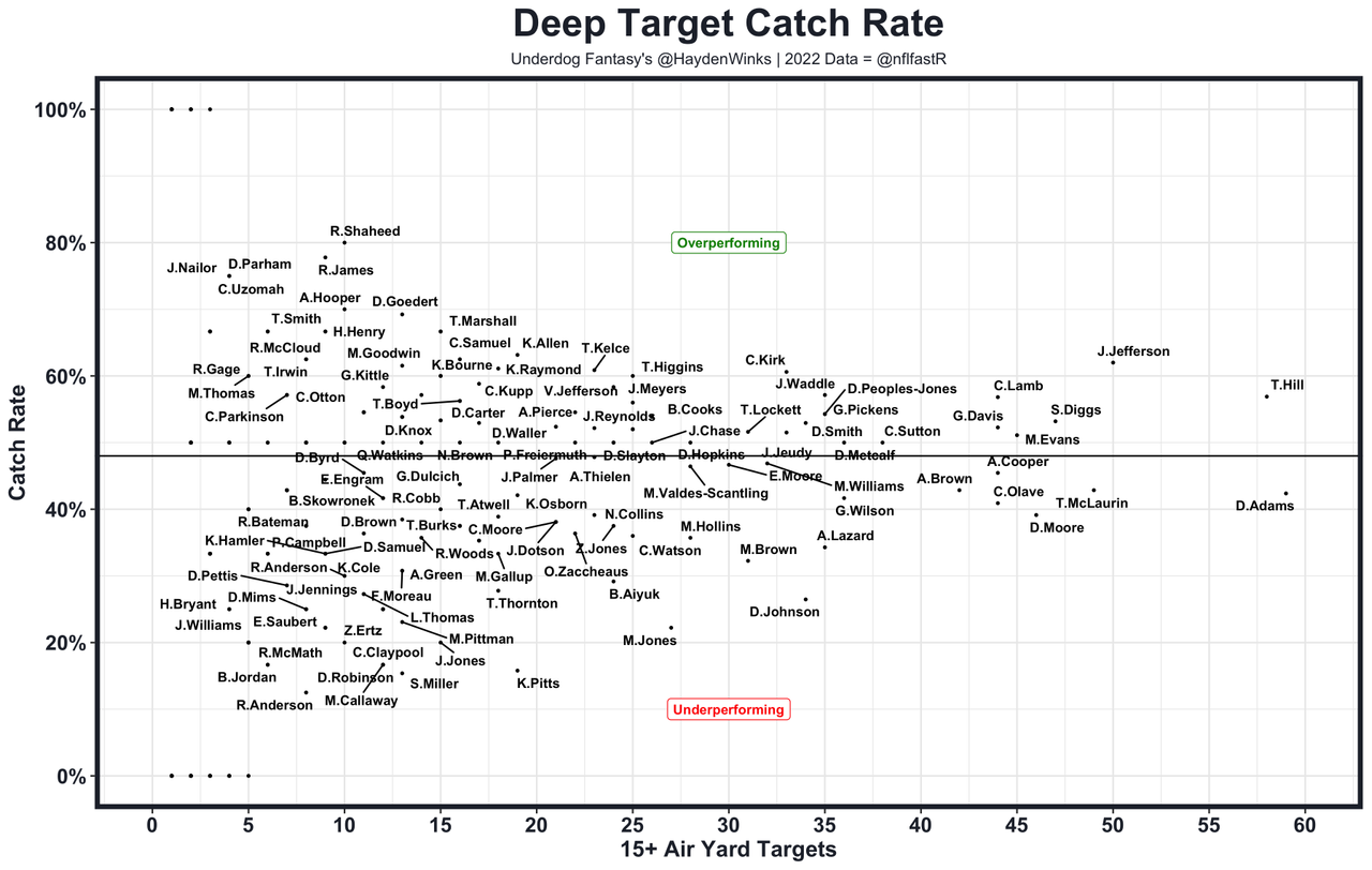 Chris Olave is a stud. His 2.4 yards per route run put him in a rare rookie class, and he did so running real routes at the intermediate and deep levels. Olave can beat press on the perimeter, leaving him with a Calvin Ridley like profile. Even with playing like a total stud, Olave was only the WR34 in fantasy points over replacement per game in this odd offense that gave him just 3.7 expected touchdowns based on his usage. In theory, Carr is an upgrade for Olave because Carr has been more willing to throw deep. In practice, there's not many balls to go around (26th in pass attempts). I fear he's a better in real life player at this Round 2 fantasy cost, but year two is when WRs make the biggest statistical leap. ... Michael Thomas has played 10 games since his 145-catch season in 2019. He only made it 3 games (16-171-3) last year before another lower-body surgery. He's at least lifting heavy and is expected to practice in training camp heading into his age-30 year. Thomas' 1.6 YPRR in a small sample last year was a career low, another sign that he's like a No. 2 possession receiver moving forward. The Saints restructured his contract this offseason to account for the boom-bust nature of his profile. ... Rashid Shaheed is a silent killer, who came out of nowhere as an undrafted rookie en route to a WR62 finish. His deep target excellence will majorly regress, lowering his 2.6 yards per route run from last year. But he ran legit routes and was quite crafty, even underneath. Shaheed is a worse version of the Olave profile, which is a compliment. I like him as a real No. 3 receiver in the NFL.