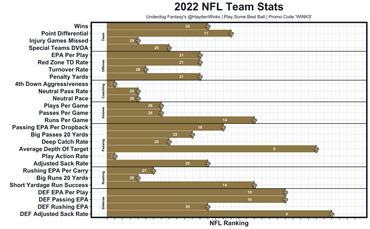 I'm worried about the Saints coaching staff. They were last in 4th-down aggressiveness, last in play-action rate, 29th in neutral pace, 29th in neutral pass rate, 25th in special teams DVOA, and 21st in penalty yards. Things like this happen with defensive-minded head coaches, especially with middling QB play. The Saints believe Derek Carr is a big upgrade over Andy Dalton, but that wasn't the case last year at least. Dalton was graded better by PFF, had higher completion percentage over expected, more big time throws, fewer turnover worthy plays, and more yards per attempt. They need that to flip to counteract the poor depth given the Saints recent years of cap trouble.