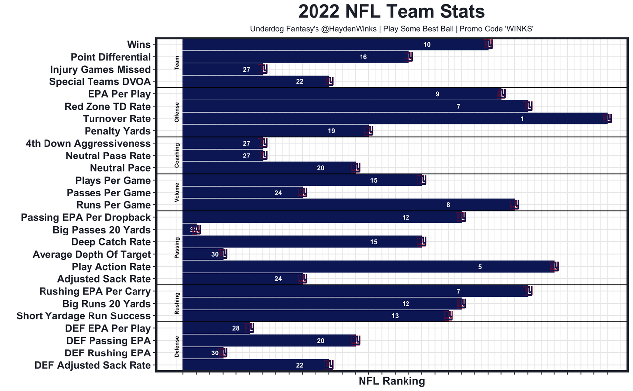 Coach Brian Daboll maximized last year's Giants roster. They won more games than they should've, turning Daniel Jones into a largely mistake free QB (1st in turnover rate as a team) while using his rushing ability to win in the red zone (7th in red zone TD rate). They scrapped together the No. 7 rushing offense despite poor blocking grades, too. Point being, the scheme is rock solid. Now they need to add more talent. Perhaps Darren Waller's addition has ripple effects, as the passing numbers last year were tough to swallow. They were last in 20+ yard pass plays on the 3rd-lowest average depth of target. That needs to improve to be a real playoff contender this year. The Giants also have room for growth on defense, where got some QB pressure on passing downs but were 30th in rushing EPA allowed.