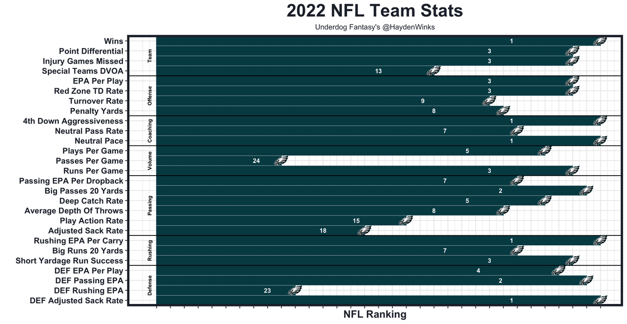 This team is a juggernaut without much personnel turnover. The coaching staff maximizes the production, too, ranking 1st in 4th-down aggressiveness, 1st in neutral pace, and 7th in neutral pass rate. Jalen Hurts' skill set converts 3rd and 4th downs at an elite clip because they figured out how to properly use his size, and when they do pass, the Eagles were 7th in EPA per dropback. They win with the deep ball (2nd in 20+ yard passes) while running it down your throat when needed. I don't see a big drawback in 2023. In fact, if the defense regresses after ranking 4th in EPA allowed, then the offense will have more chances to play in neutral game scripts in the 4th quarter. That's the only reason why the Eagles were 24th in pass attempts.
