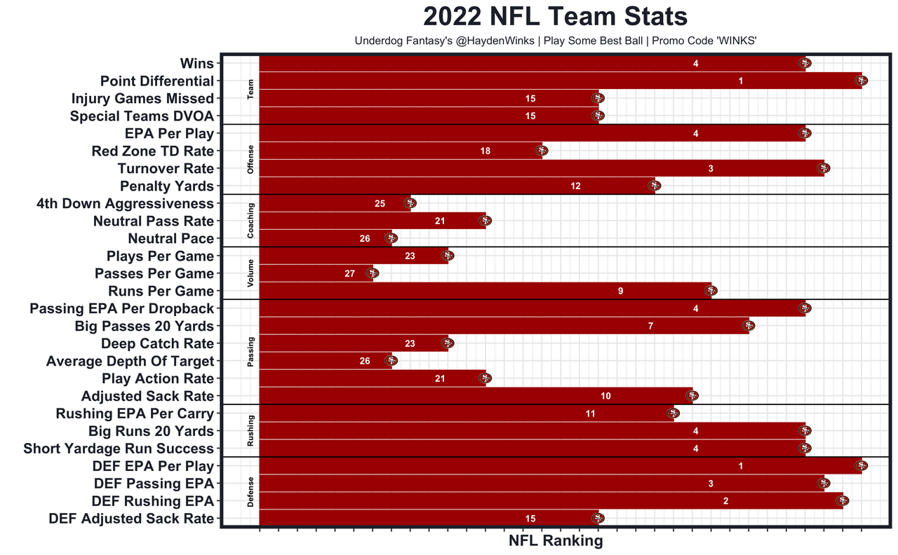 The overall play volume and 4th-down conservativeness can be frustrating, but Kyle Shanahan is the man. His offenses have been 4th, 15th, 7th, and 5th in yards with sub-par QB and OL play. It helps that this is arguably the best pass-catching group in the NFL, all of whom have versatile skillsets. The 49ers ranking 7th in big play passes on the No. 26 average depth of target and No. 23 deep-ball catch rate is simply outrageous but makes the uncertainty at QB less of a fear going into 2023. Of course, the ceiling of the team is tied to whoever wins the QB competition (and their health). Meanwhile 2022's No. 1 EPA allowed defense is littered with All Pro talent once again.