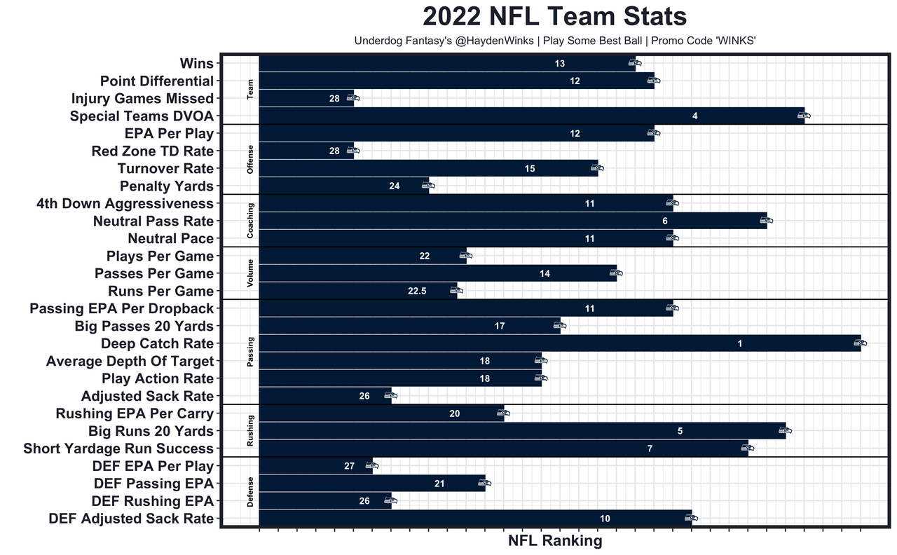 The Seattle Seahawks weren't perfect in Geno Smith's first year, but they were a very fun team. Their offense led the NFL in deep ball catch rate and were 5th in big play runs. The entire skill group is full of home run threats, and Smith's accuracy is a weapon of it's own. There's still room for this No. 26 adjusted sack rate OL to improve (they're young). Same with the defense (27th in EPA allowed). If both improve, this team is a sneaky contender in a down NFC. If neither improve, at least we can have plenty of fun in fantasy land.
