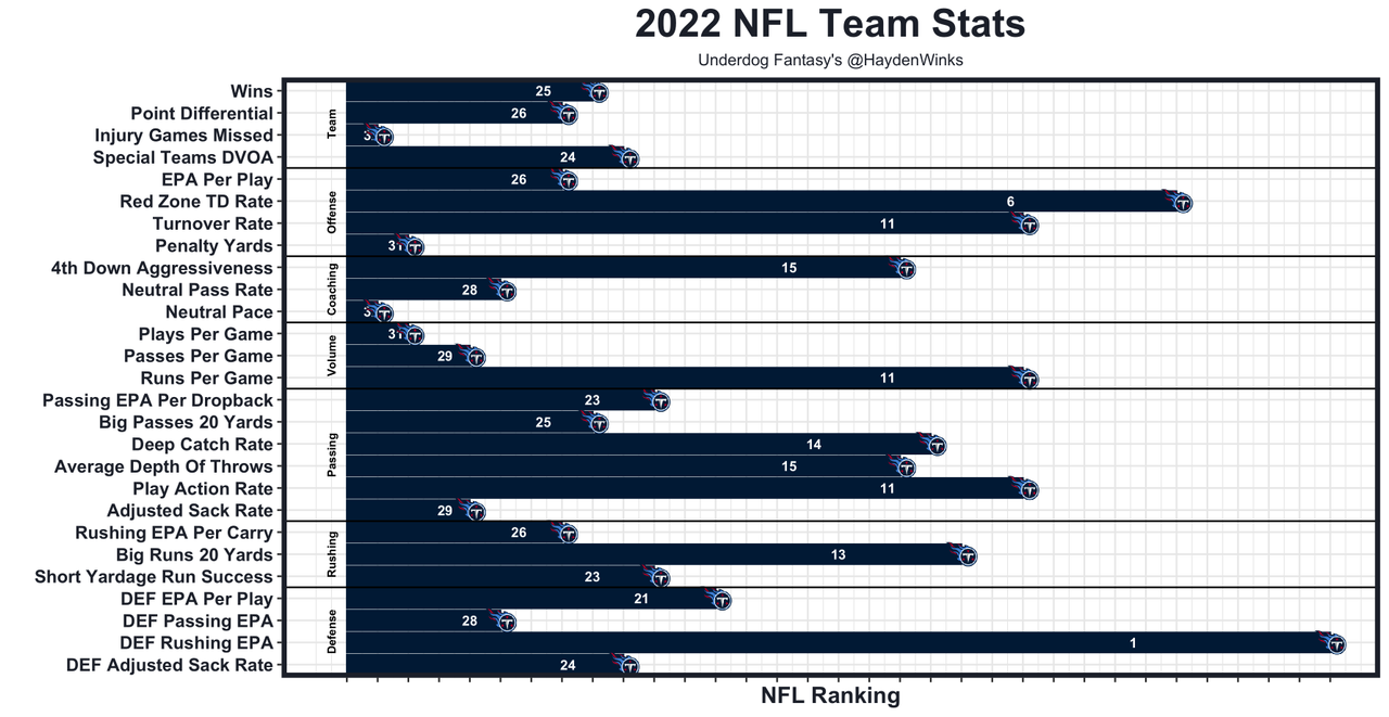 The Titans were devastated by injuries (32nd), penalties (31st), bad OL play (29th in adjusted sack rate), and special teams (24th). That's a far cry from what the Titans looked like just a couple years ago, but this is a past-prime roster led by potential trade candidates Ryan Tannehill and Derrick Henry. Without A.J. Brown, the Titans dipped to 25th in big play passes and 29th in overall passes per game. Treylon Burks needs to break out for this offense to have a chance, and even if he does, the Titans will be near the very bottom in volume. They were 28th in neutral pass rate and last in neutral pace. Slowing games down in hopes their beefy defensive line can take control is the team's identity. That hasn't been a winning formula in this era.