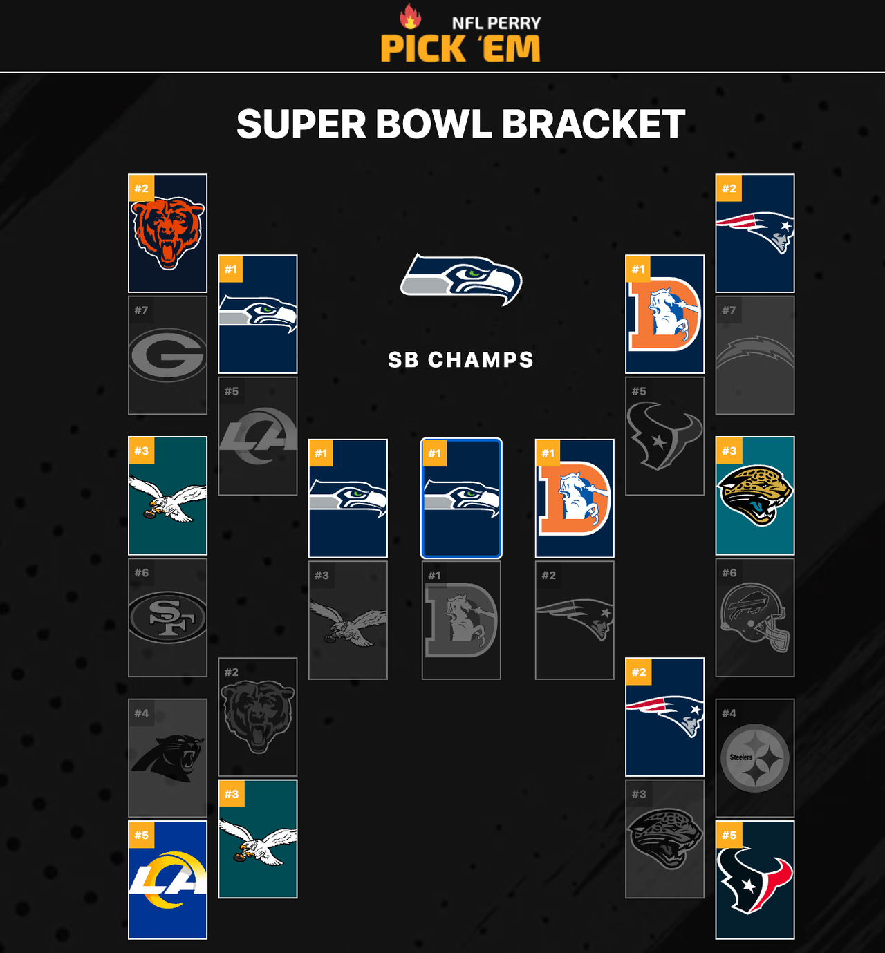 Patriots: Seahawks, Rams, Eagles \\ Broncos