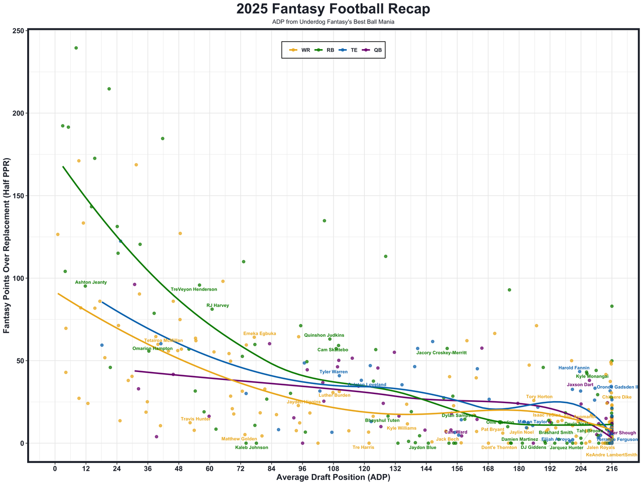 Old RBs can win ambiguous backfields. It felt like every best ball podcast was about the Jaguars, Cowboys, Bears, and Patriots backfields, and for correct reasons. Those offenses felt stable with upside (all very true), but they didn't have proven winners per consensus. Each had a rookie with plenty of hype and a veteran without it. TreVeyon Henderson, Bhayshul Tuten, and Kyle Monangai had moments (Jaydon Blue didn't), but the best picks were easily Travis Etienne, Javonte Williams, D'Andre Swift, and then Rhamondre Stevenson in Week 17. If every thinks boomers are wrong and this is a peer-vs-peer game, then maybe being the contrarian is sharp. Boomer it up.