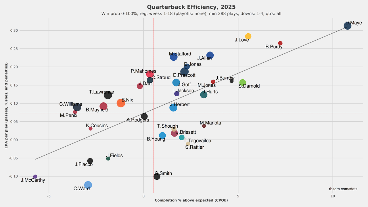Josh Allen doesn't have an efficiency or head-to-head case against Maye nor a total volume case against Stafford, but he still played like an MVP for most of the season. I'd also argue in unideal circumstances. The Bills wide receiver room was amongst the very worst in the NFL, and their ground game, while very good, is partially tied to his legs. Amongst playoff teams, the Bills were as reliant on super-hero plays from their QB as anyone. Allen still finished 4th in EPA per play and dragged an injured defense to a 12-5 record.