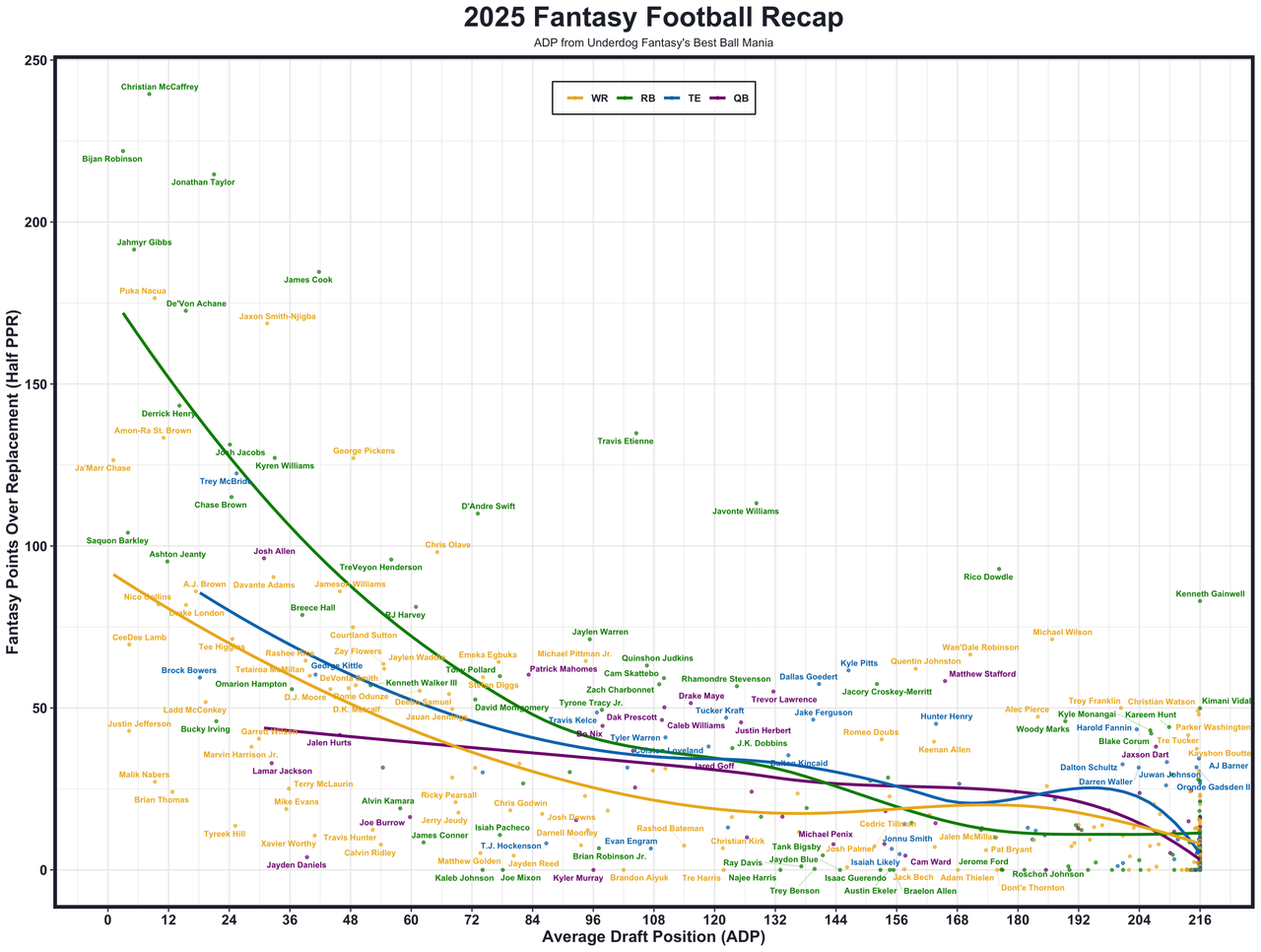 This was a very down year for the award, but Tetairoa McMillan squeaks by after eclipsing 1,000 receiving yards on a "playoff team" as the very clear best skill player on the team. McMillan was the WR20 in receiving yards per game (59.6) and the WR28 in EPA added (+25.8) despite up-and-down QB play as the X receiver. The rookie showcased enough speed to run away from DBs after the catch and threaten vertically. That was the lone question on his otherwise high-floor prospect profile. His upside is similar to Drake London's, and he will be a top-50 pick in fantasy football drafts once again.