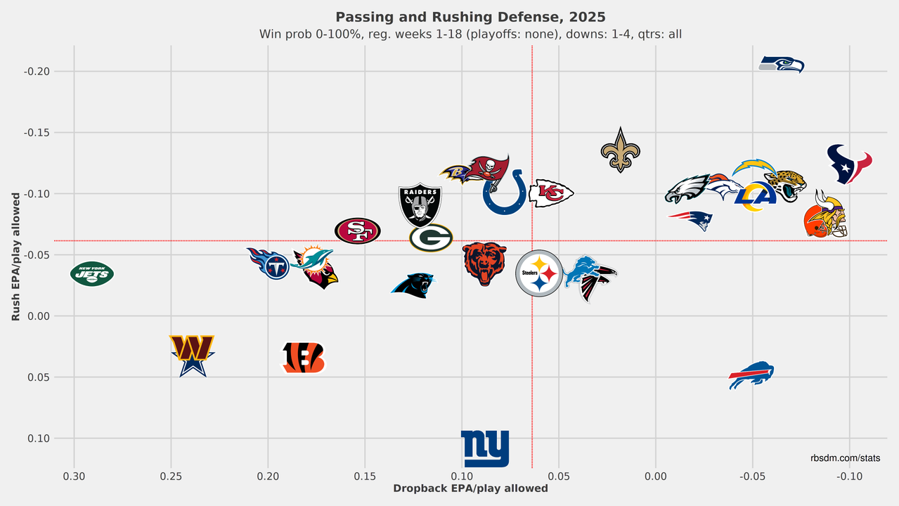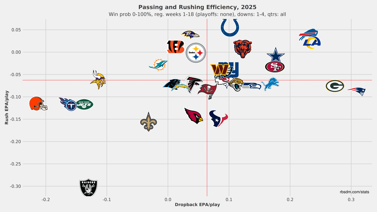 The Bears were 26th in EPA per play last year, added Ben Johnson (and a new OL and multiple skill guys), then finished 8th in EPA per play in 2025. That's coaching. Chicago created an identity with outside zone runs, especially after an early-season bye, and the Caleb Williams began settling in as he had more time to learn under Johnson. Perhaps most overlooked is how good the OL turned out despite having zero chemistry together. ESPN's Block Win Rate graded them 1st on pass plays and 6th on run plays. There's a lot of communication required to pull that off. Ultimately, the Bears won a division that entirely finished above .500, and the defense was only 20th in EPA per play.