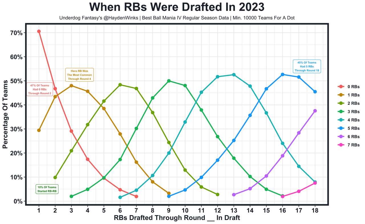 The first team started with WR-WR, but then I pivoted to a bunch of RBs while others pushed up the receivers. Only 20% of teams in last year's Best Ball Mania had 4 RBs through Round 9 like this team did (see chart below), so there's really no point in adding more after getting so far ahead. The second team started with potential legendary upside RB Breece Hall in the 1st round and had an RB3 in Round 7 (only 35% of teams had 3 RBs by then last year), so I was okay with staying with a 4-RB build despite having handcuff-only CEH as my 4th option.