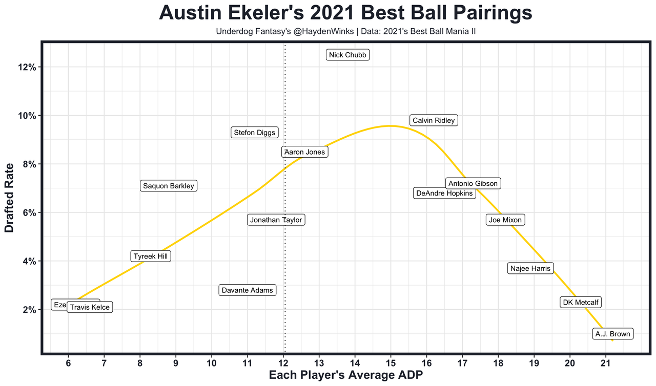 Let's use this chart I made in 2022 to visualize the science of unique pairings. Austin Ekeler was drafted 12th overall in 2021, and he was most commonly paired with the players ranked just after him in average draft position. Nick Chubb (14th in ADP) was on 12% of Ekeler teams. Calvin Ridley (15th), Aaron Jones (13th), and Stefon Diggs (10th) were all over-represented on Ekeler teams, too, just because they were frequently at the very top of the queue. Meanwhile, AJ Brown (21st in ADP) was paired with Ekeler just 2% of the time despite not being that much worse of a projected player than the Ridley types going ahead of him. Getting Ekeler paired with Brown was the smart way to build out of a relatively disadvantaged spot in the randomized draft order.