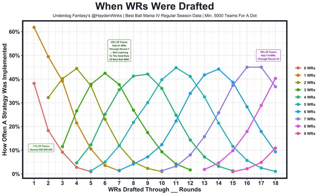 On teams with only 3 WRs through Round 7, my new goal is to get 7 WRs by Round 13ish. This gets me back to normal levels of WR talent despite having multiple detours in the Round 3-8 range. Just look at this funky little chart below. The dots show how many WRs best ball drafters have through each round. Only 16% of teams in last year's Best Ball Mania had 7 WRs through Round 13, while only 3% of teams had 8 or more WRs. That doesn't mean I have a ton of WR firepower, but it does give me more than the average builder at the very least. On these semi-late WR builds, I'm drafting 8 or 9 WRs almost every single time, which helps me stack quite easily.