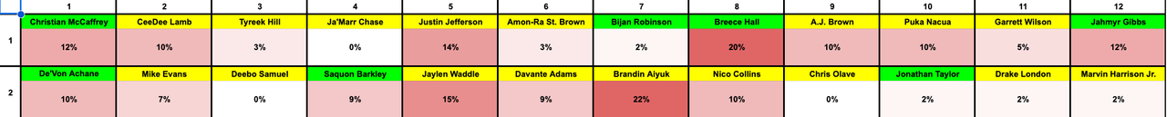 WR42 Ladd McConkey at 20%: What if Justin Herbert is really good behind a great offensive line? What if OC Greg Roman isn't as run heavy without Lamar and Kaepernick? What if McConkey, who led the Power 5 in EPA per route last year, is just really damn good? There are a lot of outs here, without a lot of target competition. McConkey's 4.39 speed and 90th percentile agility make him a tough matchup in man coverage and someone worth scheming up touches to underneath. I had a late Round 1 grade on him and love the landing spot. Our video on him is here.