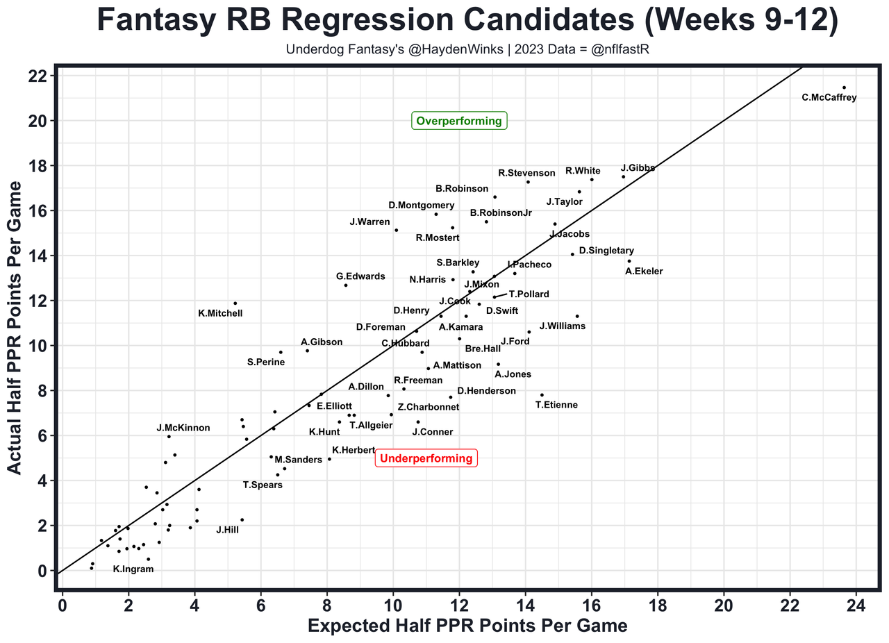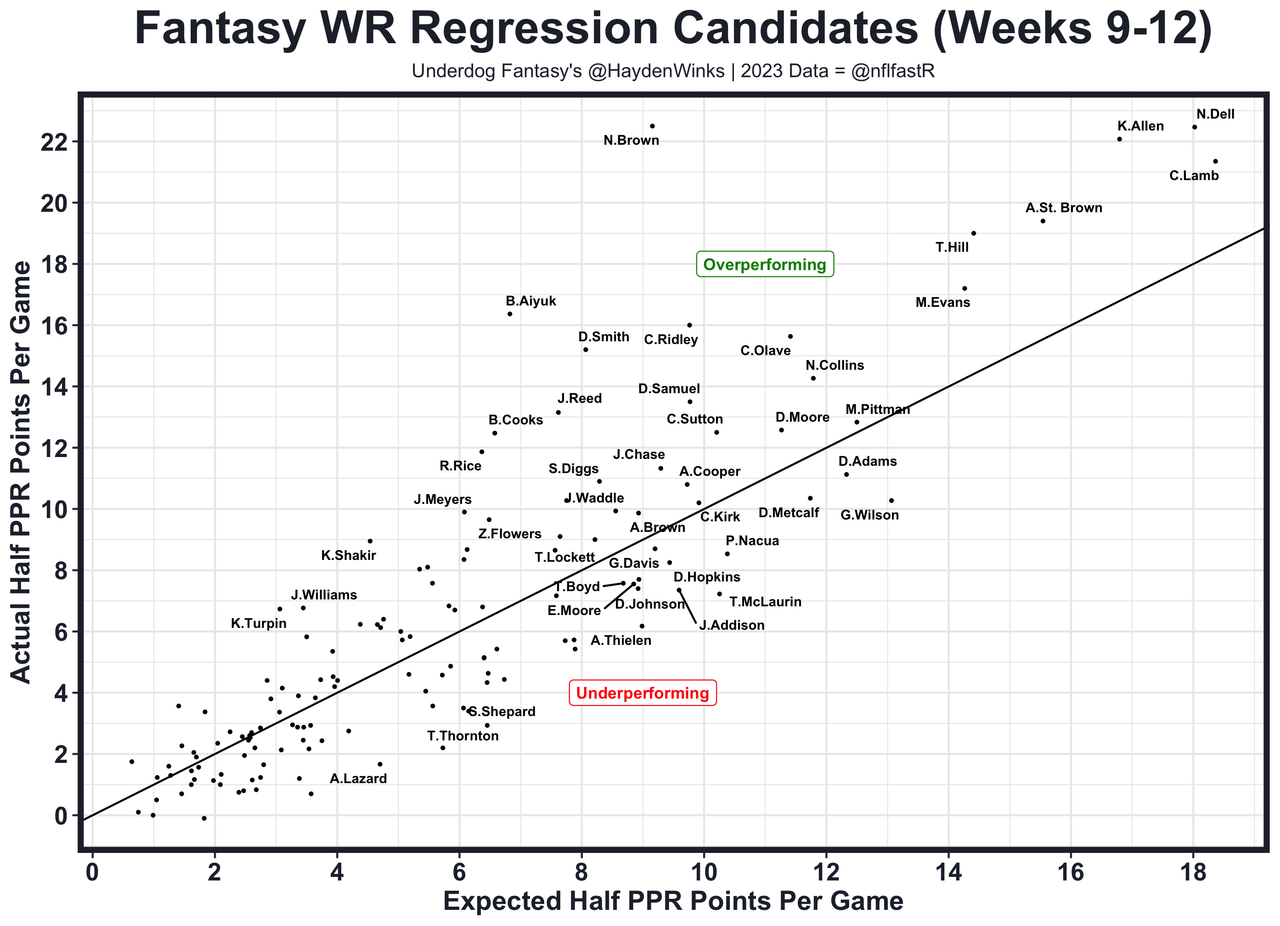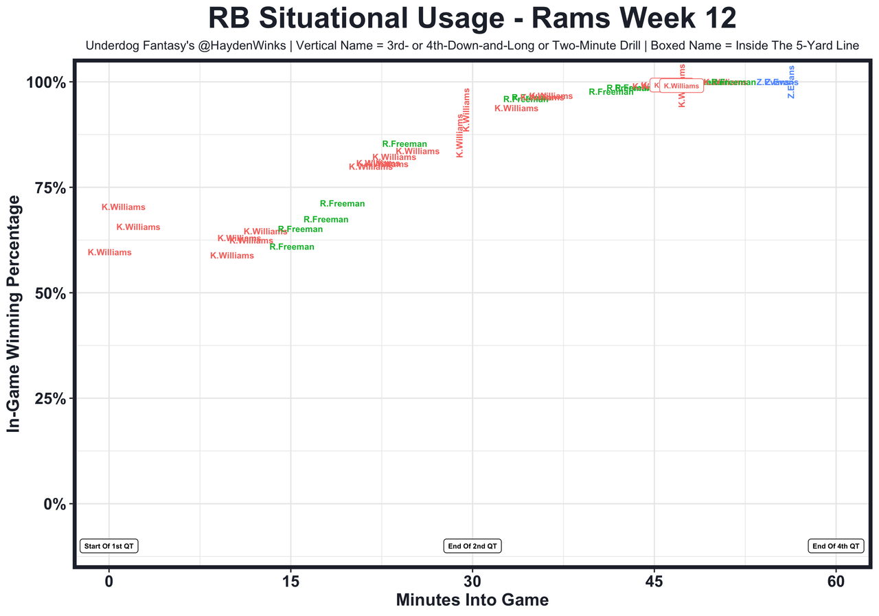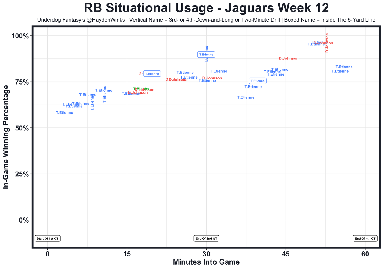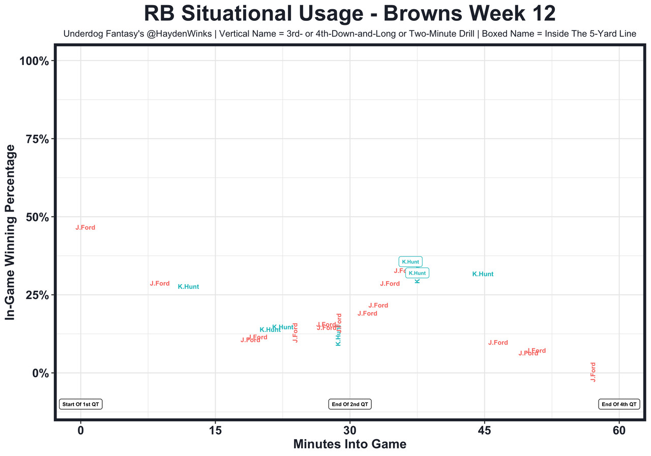 Posted every Tuesday, The Fantasy Usage Model combines my expected fantasy points model with his film notes to recap the previous week's game. An explanation of this is here, but it basically turns targets, carries, air yards, goal line touches, and other variables into expected fantasy points. We have the sickest fantasy show ever on Tuesday nights going over this column. If you have time for 1 hour of fantasy content, make it this one.