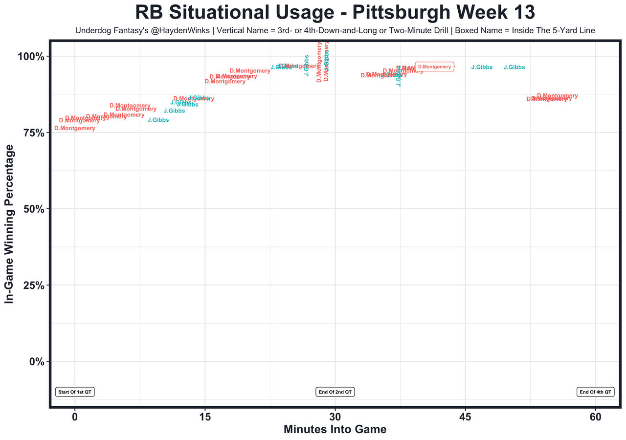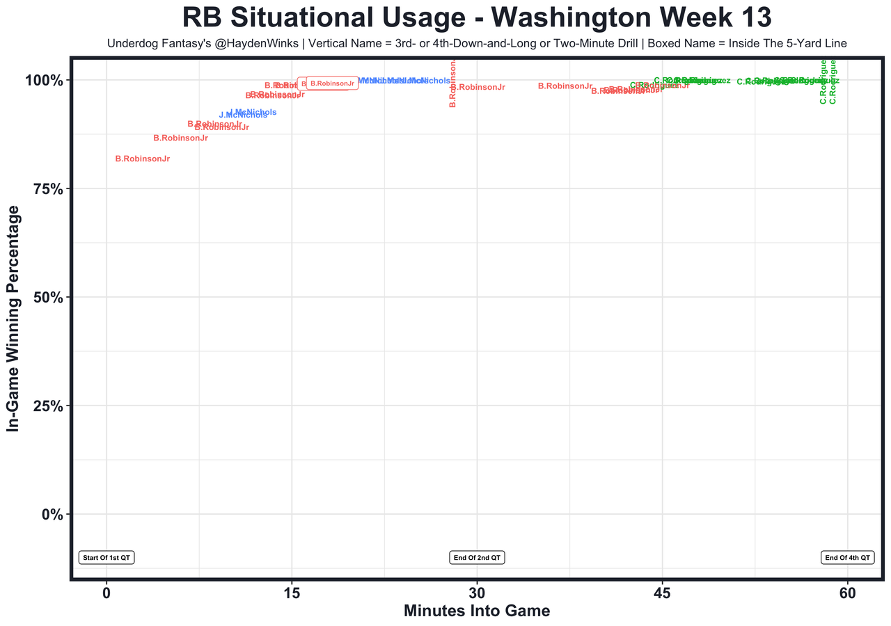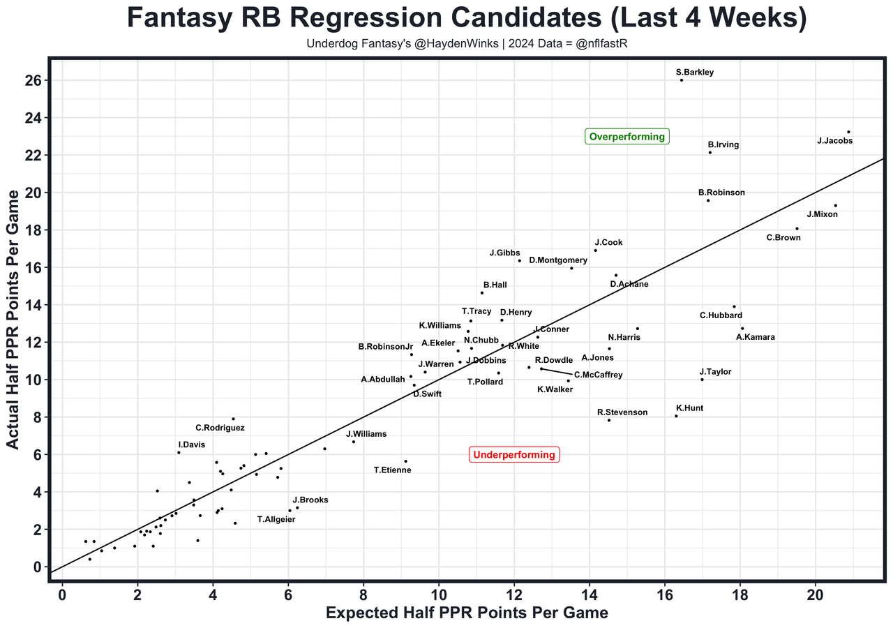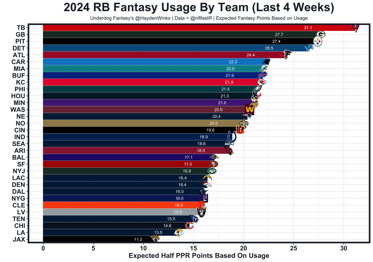 Posted every Tuesday, The Fantasy Usage Model combines my expected fantasy points model with his film notes to recap the previous week's game. An explanation of this is here, but it basically turns targets, carries, air yards, goal line touches, and other variables into expected fantasy points. We have the sickest fantasy show ever on Tuesday nights going over this column. If you have time for 1 hour of fantasy content, make it this one.
