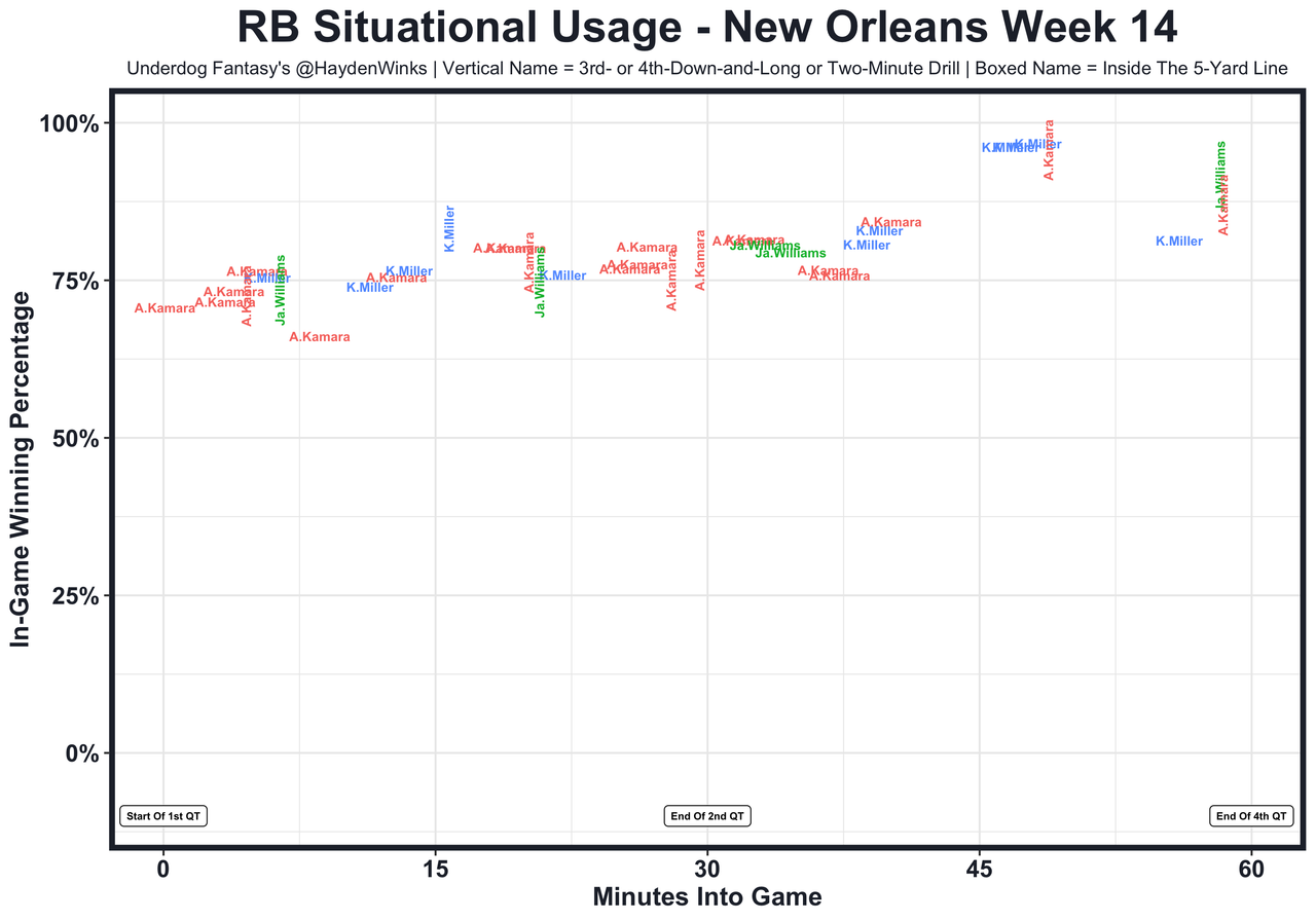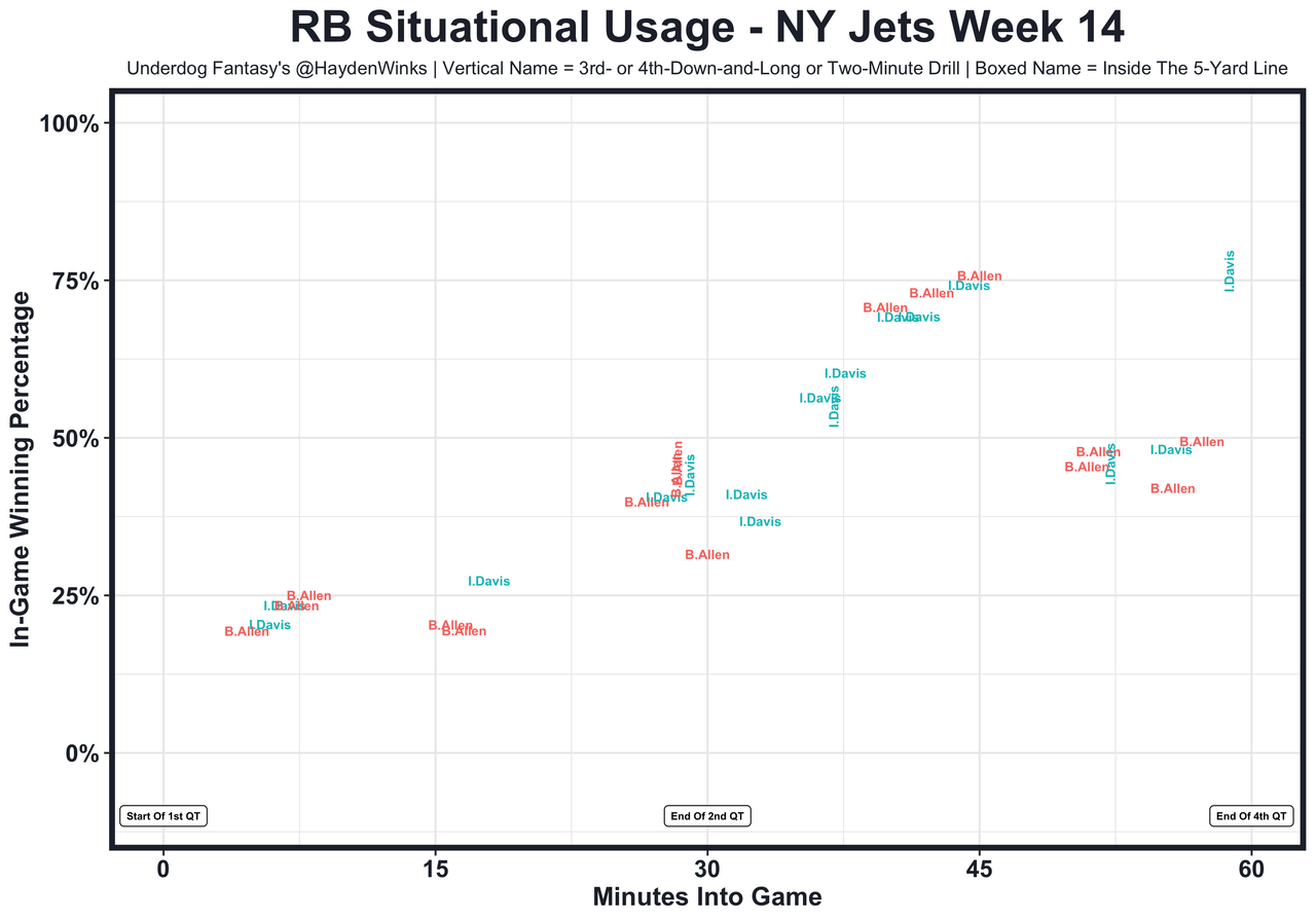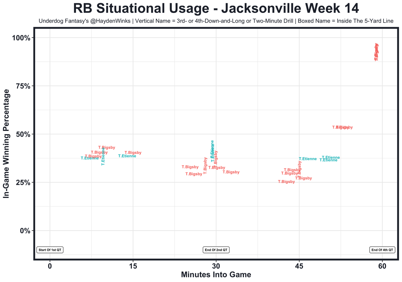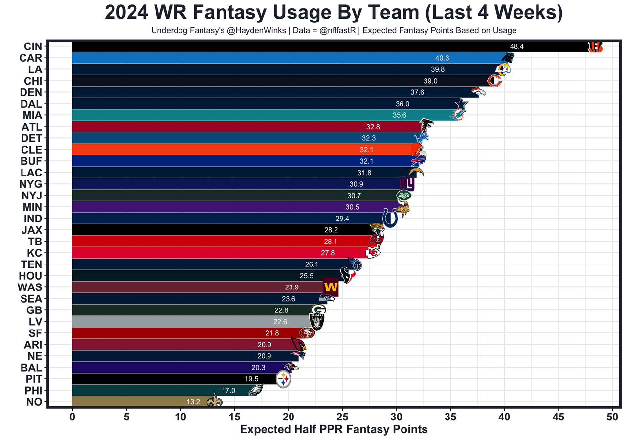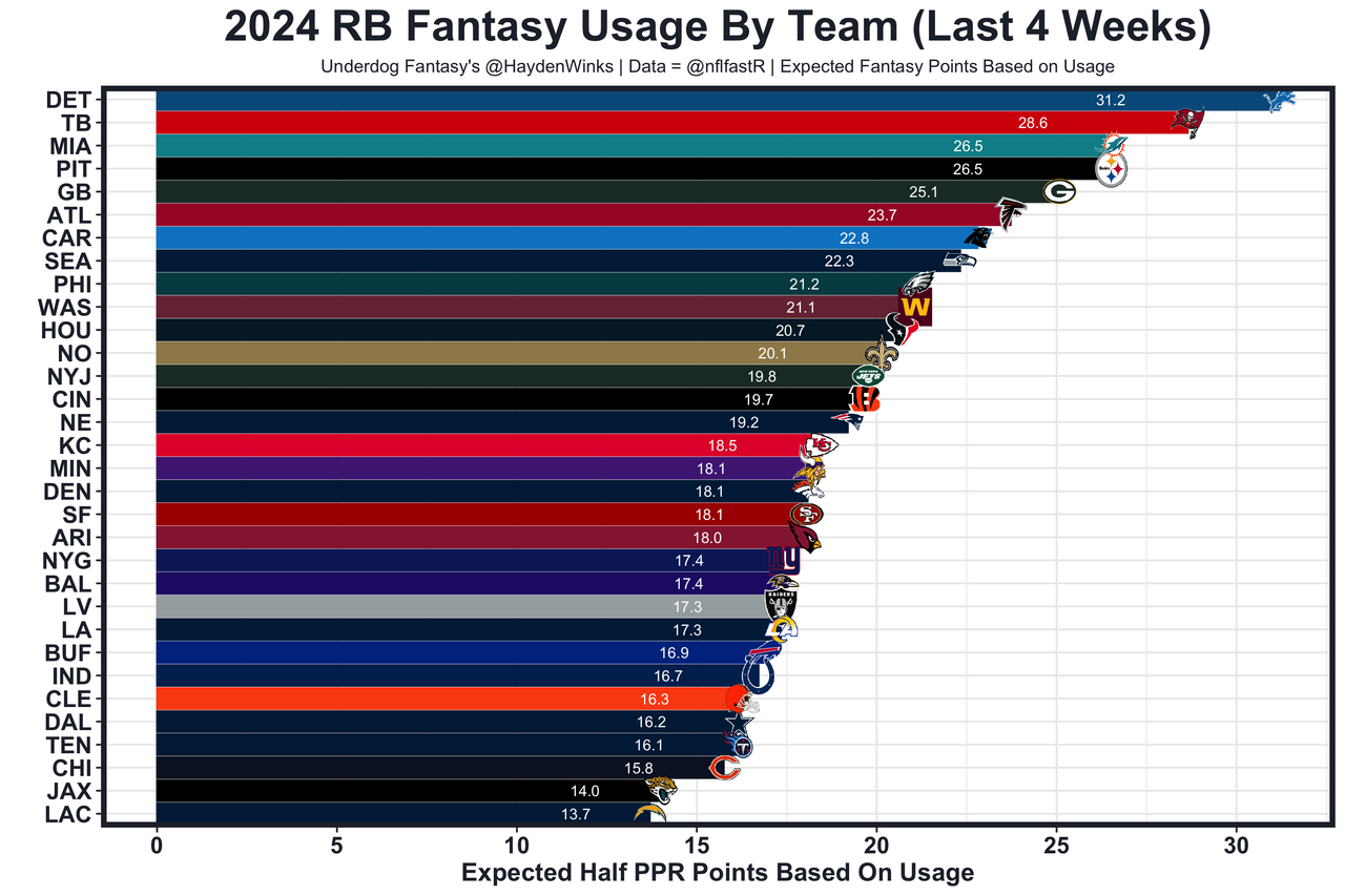 Posted every Tuesday, The Fantasy Usage Model combines my expected fantasy points model with his film notes to recap the previous week's game. An explanation of this is here, but it basically turns targets, carries, air yards, goal line touches, and other variables into expected fantasy points. We have the sickest fantasy show ever on Tuesday nights going over this column. If you have time for 1 hour of fantasy content, make it this one.